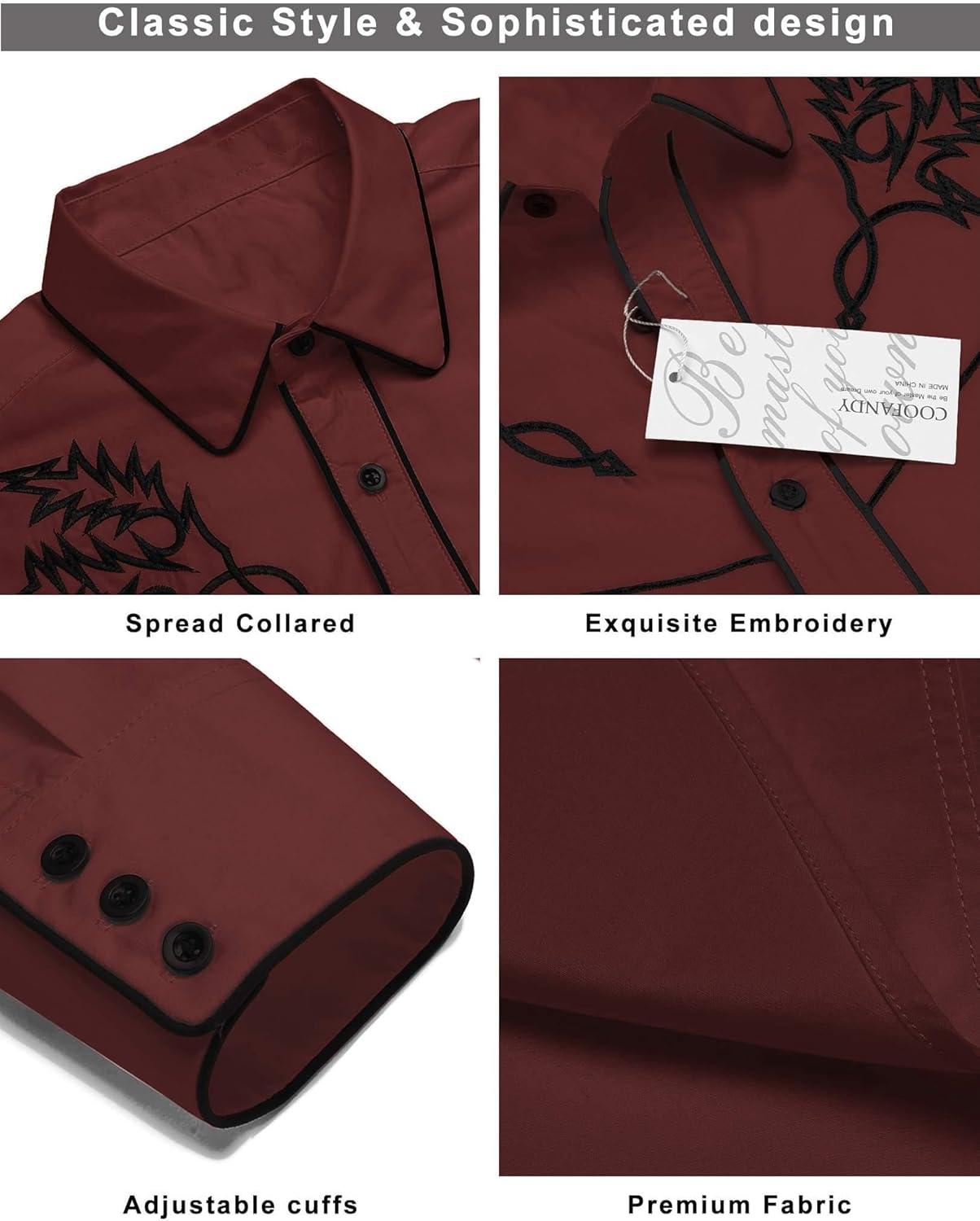COOFANDY Men’s Western Cowboy Shirt Long Sleeve Embroidered Shirt Slim Fit Cotton Casual Button Down Shirt(Wine Red)