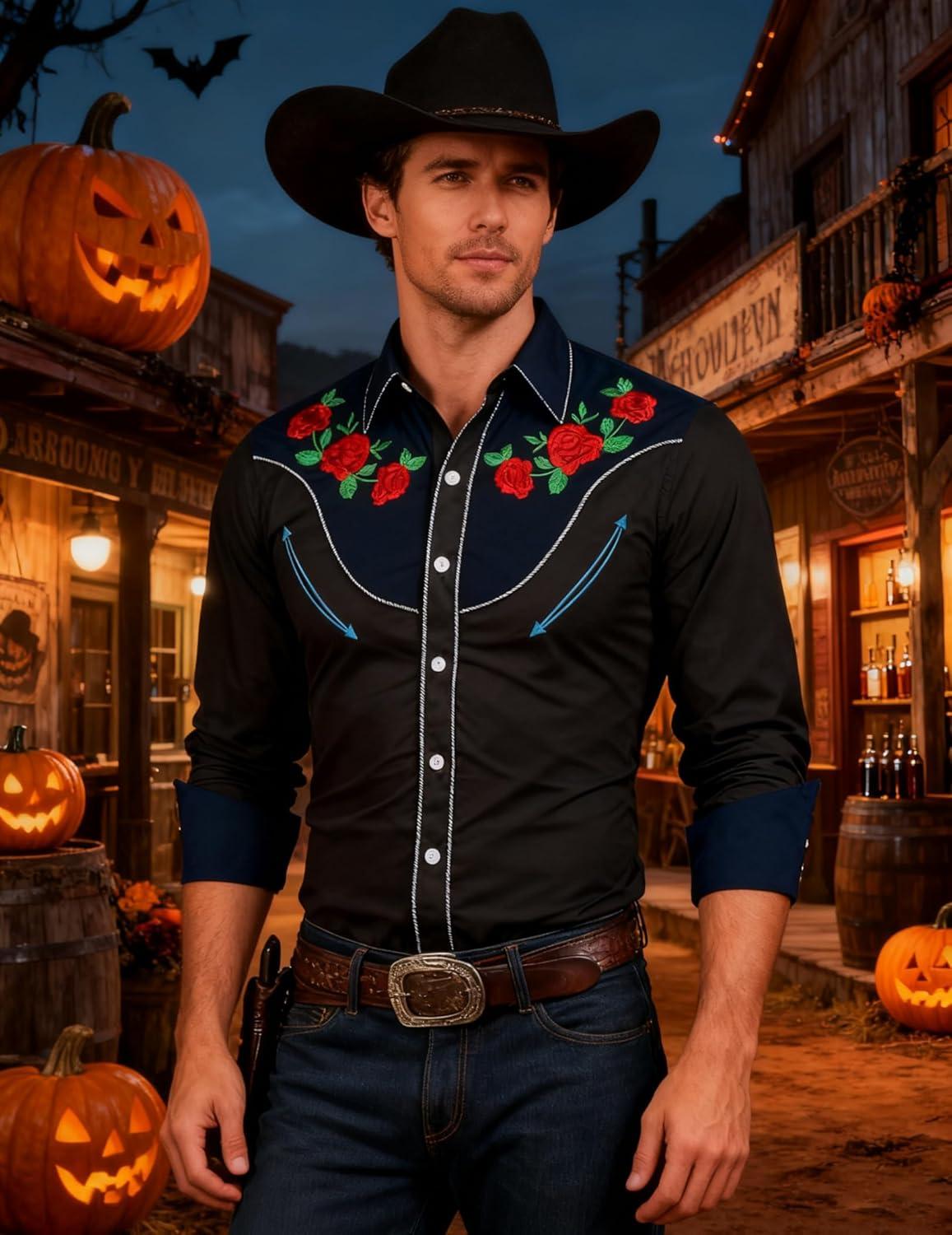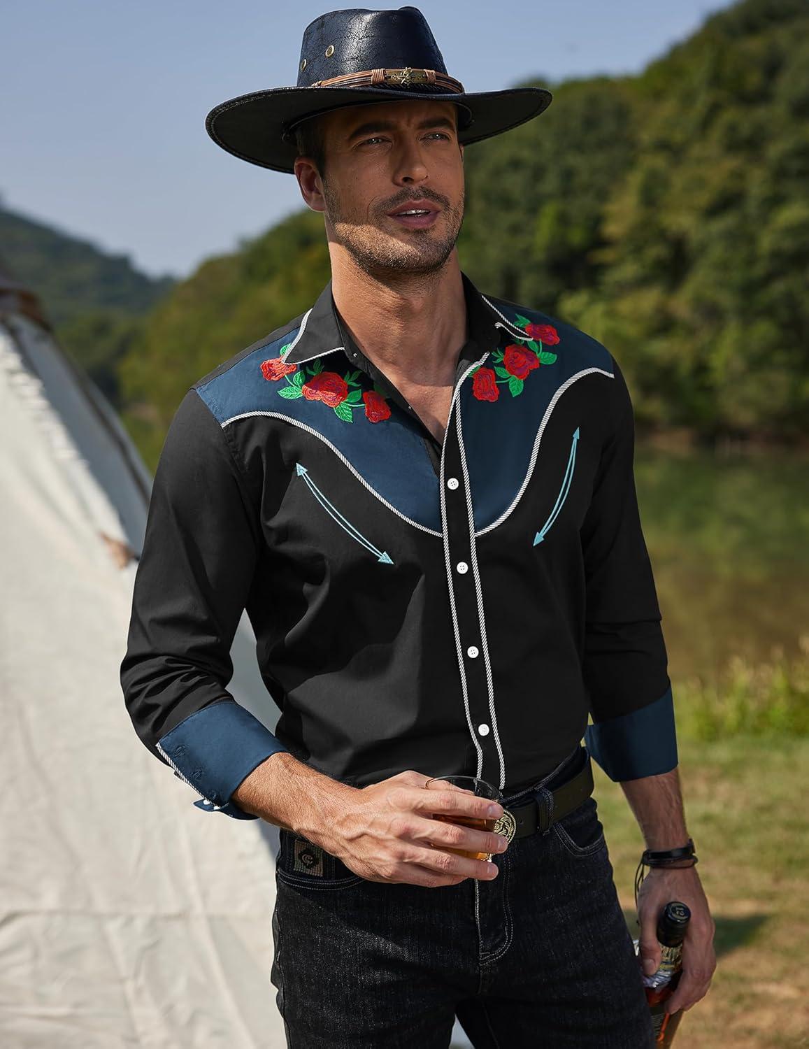 COOFANDY Men’s Western Cowboy Shirt Long Sleeve Slim Fit Rose Embroidered Cotton Casual Button Down Shirts(Black (Retro Rose))