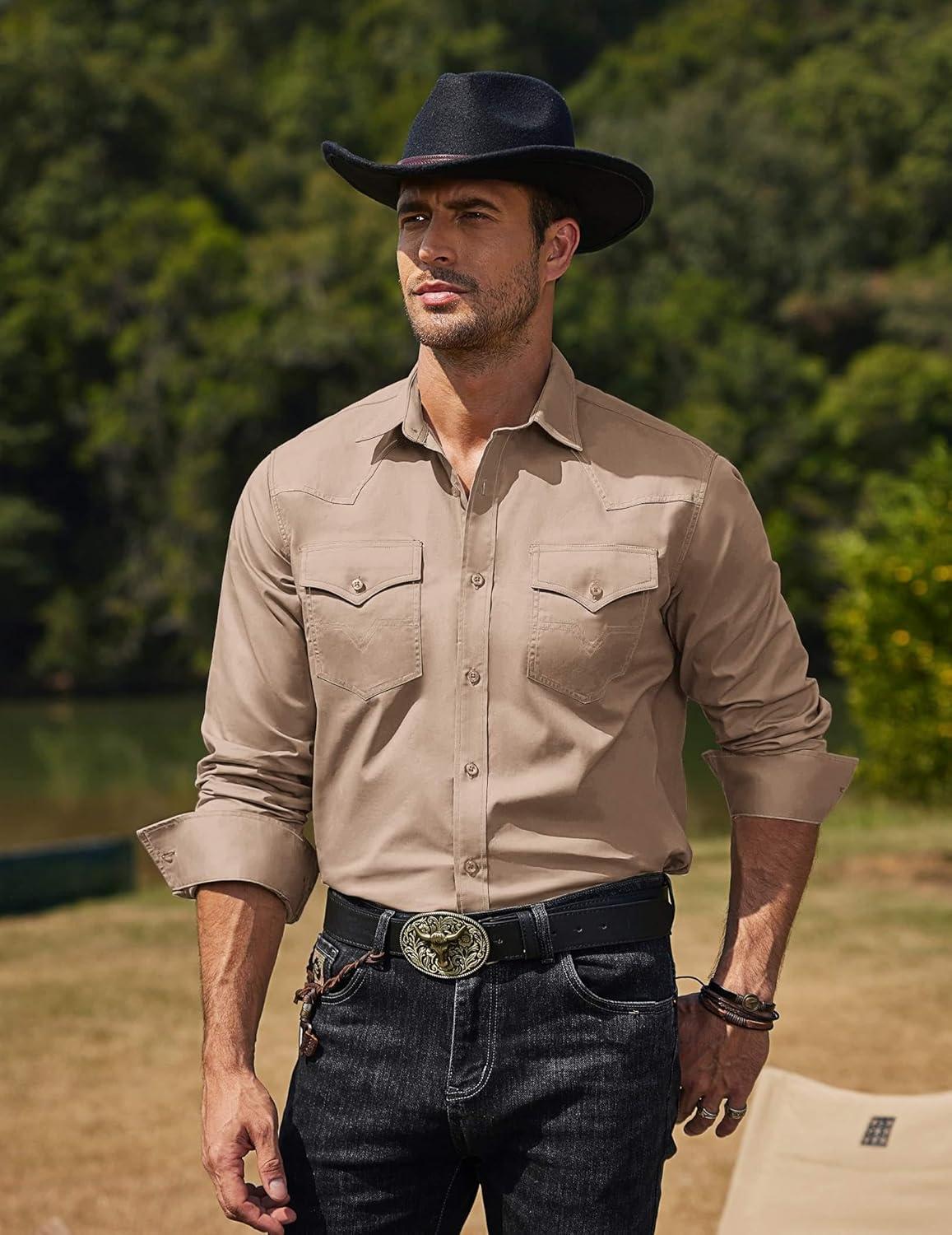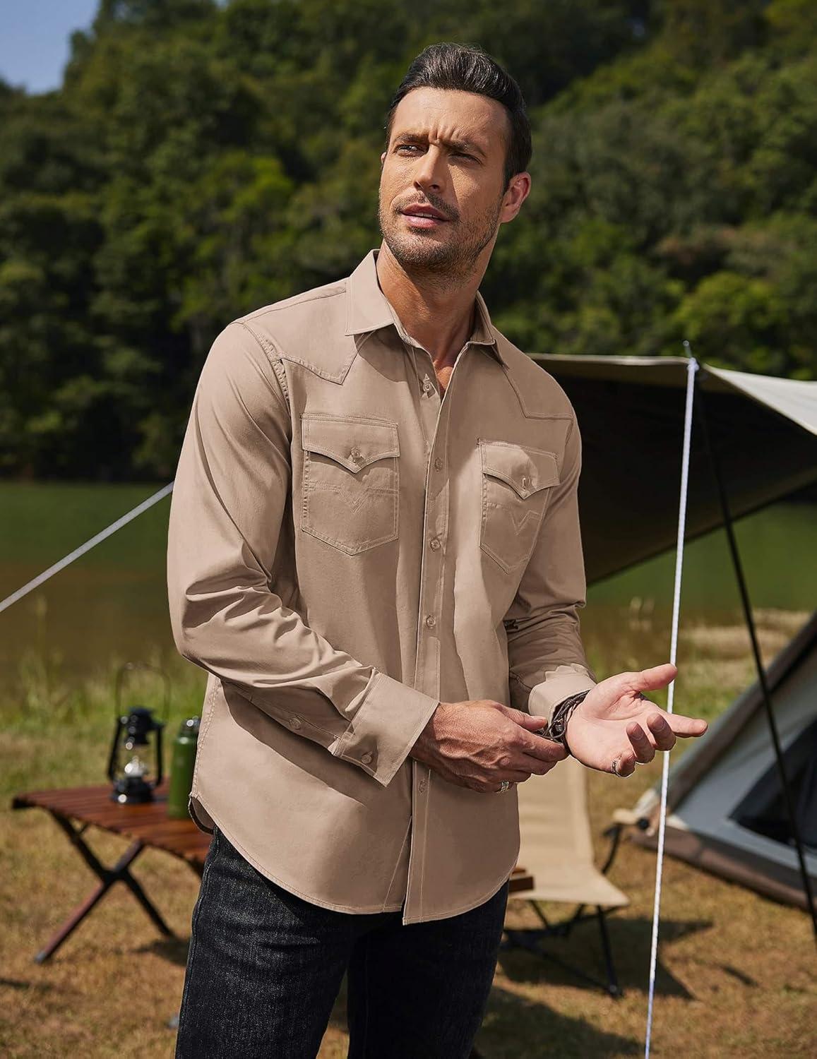 COOFANDY Men’s Western Cowboy Shirts Long Sleeve Cotton Casual Button Down Work Shirt with Pockets(Solid Dark Khaki)