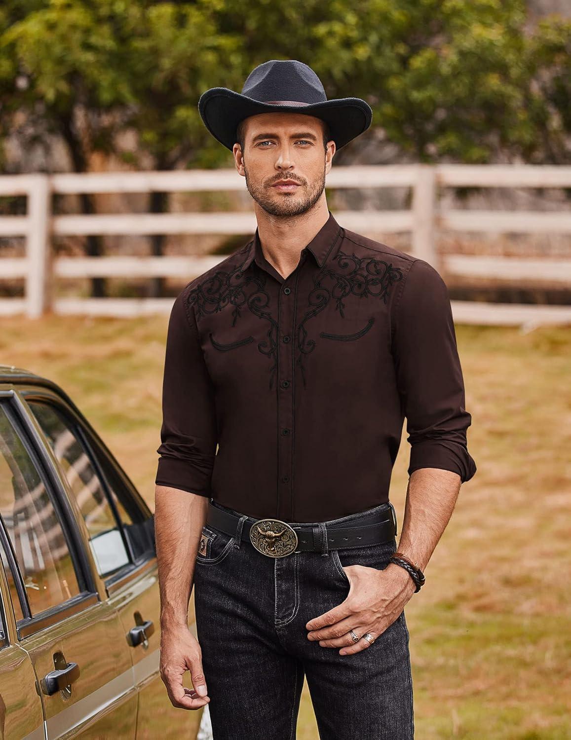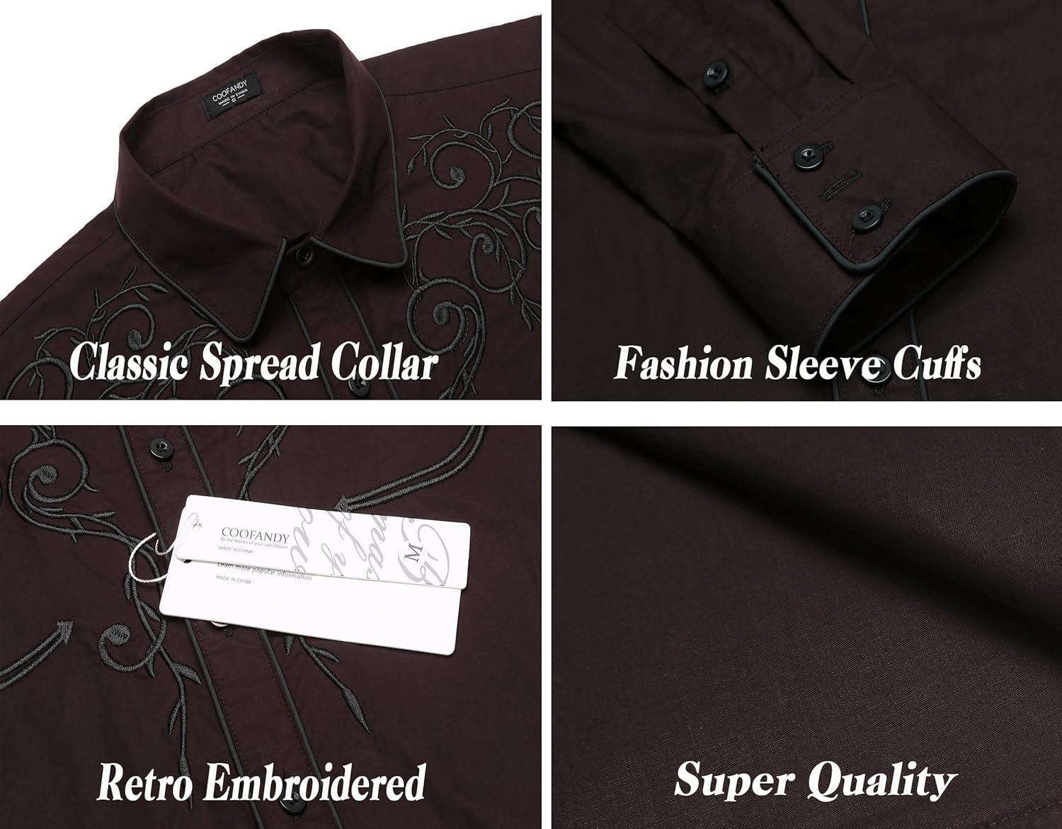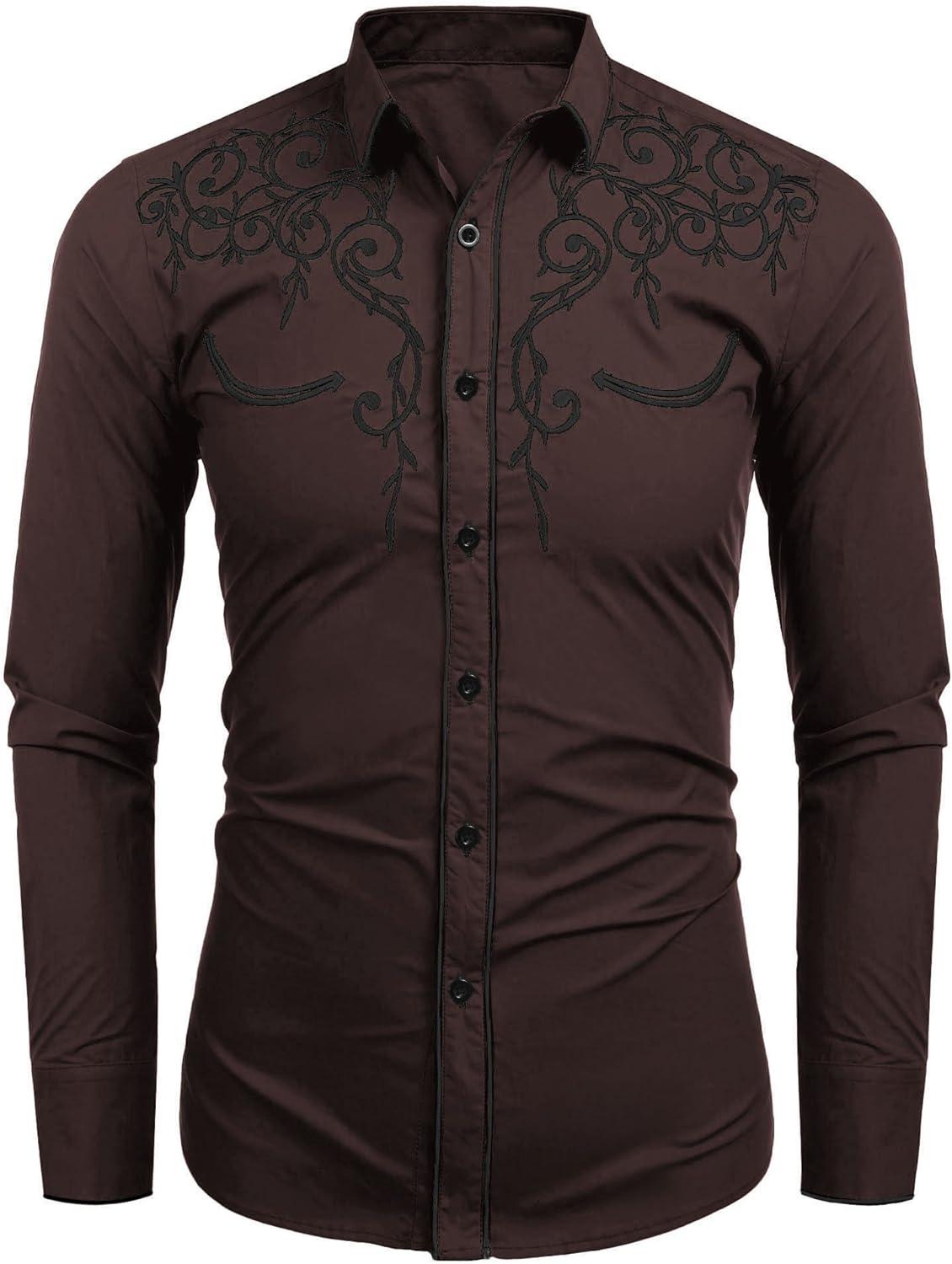 COOFANDY Men’s Western Cowboy Shirts Long Sleeve Embroidered Shirt Slim Fit Casual Button Down Shirts(Brown)