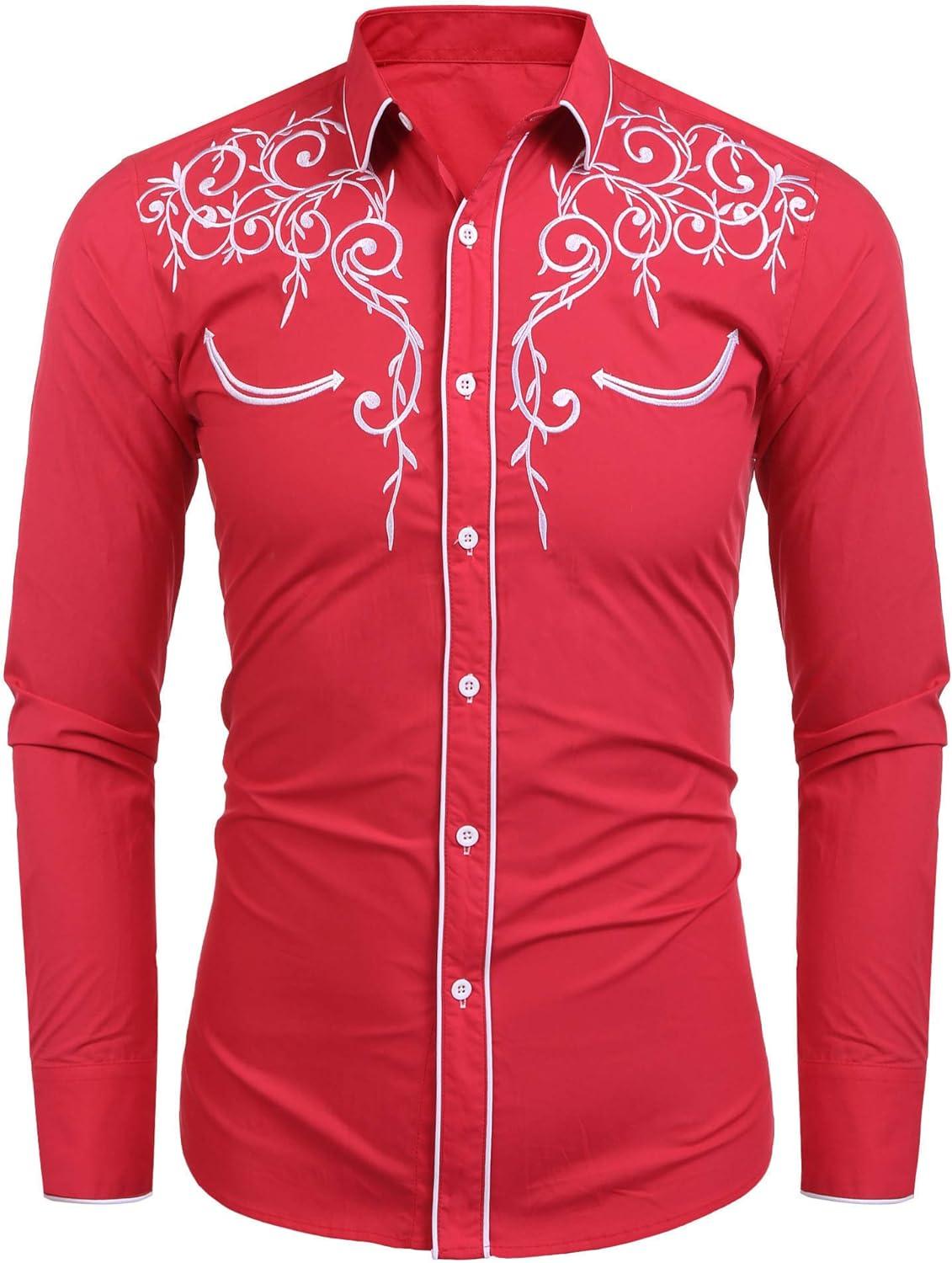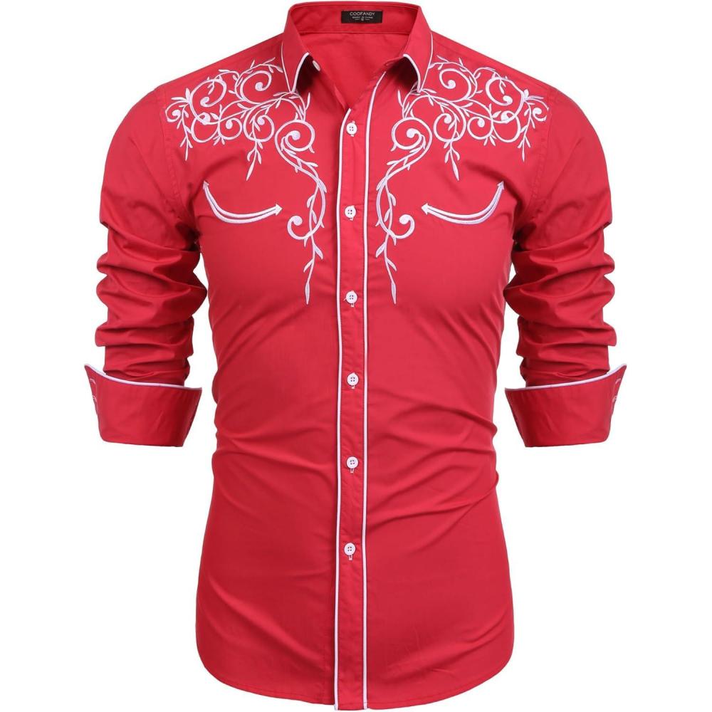 COOFANDY Men’s Western Cowboy Shirts Long Sleeve Embroidered Shirt Slim Fit Casual Button Down Shirts(Red)