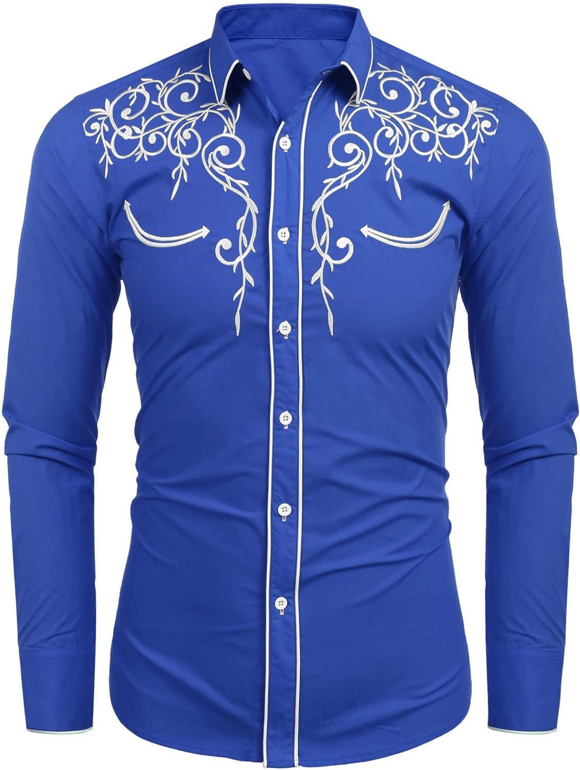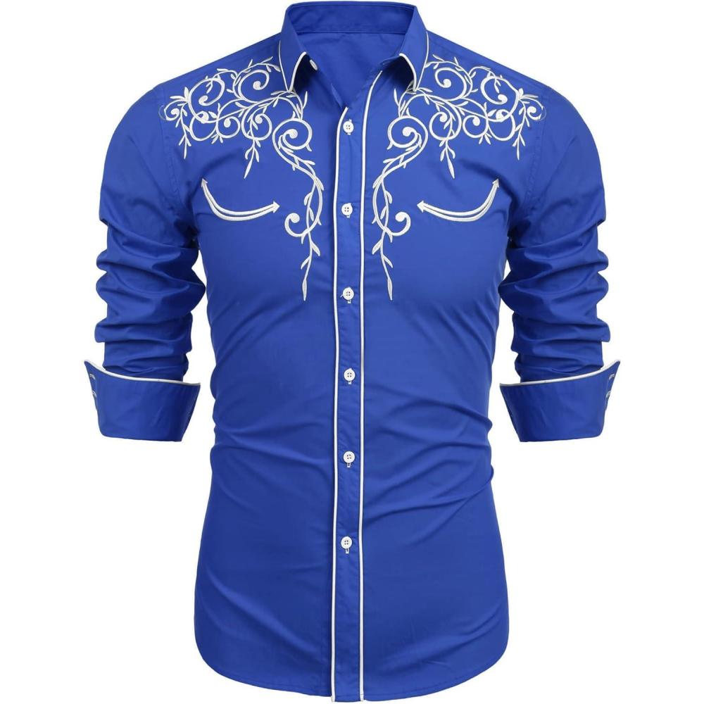 COOFANDY Men’s Western Cowboy Shirts Long Sleeve Embroidered Shirt Slim Fit Casual Button Down Shirts(Royal Blue)