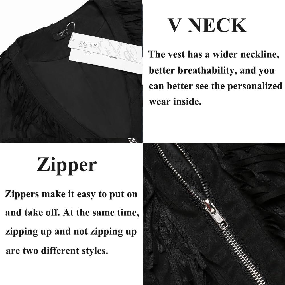 COOFANDY Men’s Western Cowboy Vest Casual Fringe Hippie Costume V Neck Zipper Suede Leather Waistcoat(Black)
