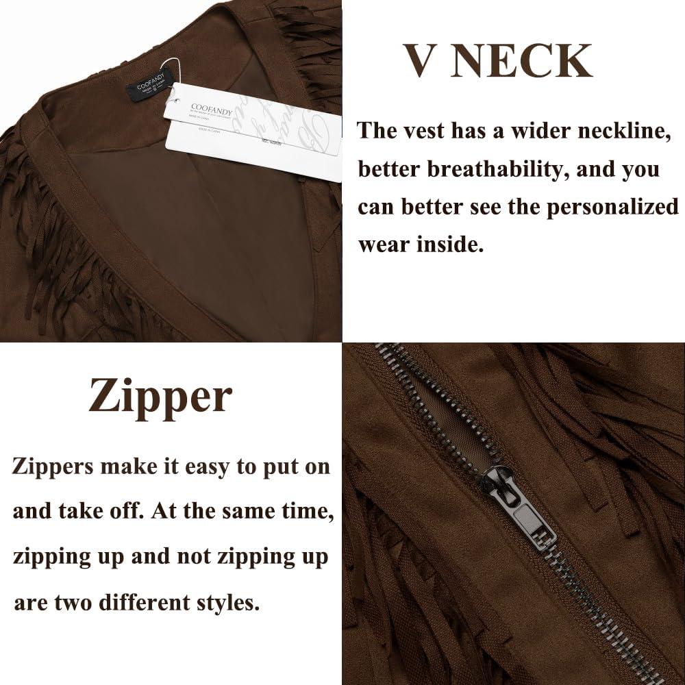 COOFANDY Men’s Western Cowboy Vest Casual Fringe Hippie Costume V Neck Zipper Suede Leather Waistcoat(Coffee)