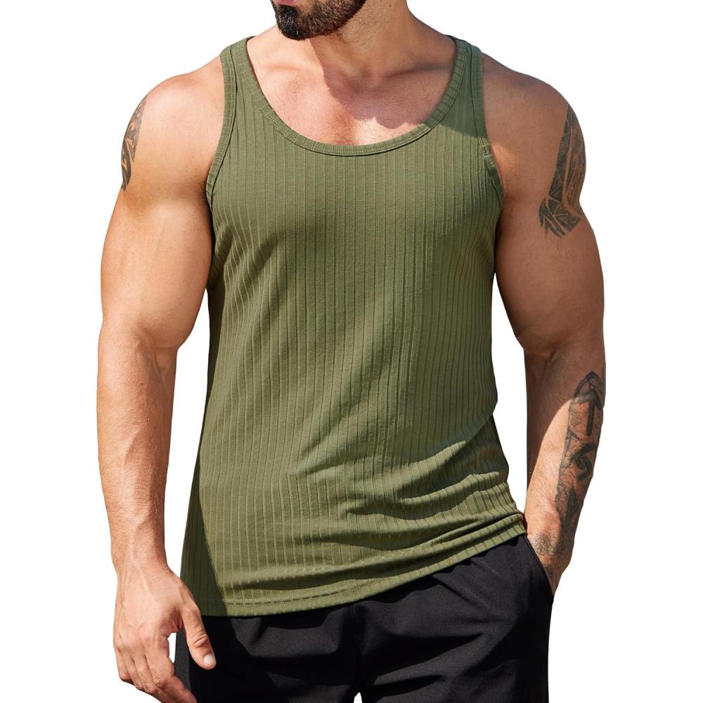 COOFANDY Men’s Workout Tank Top Ribbed Knit Sleeveless Gym Muscle T Shirts Bodybuilding Tee(Army Green(1 Pcs))