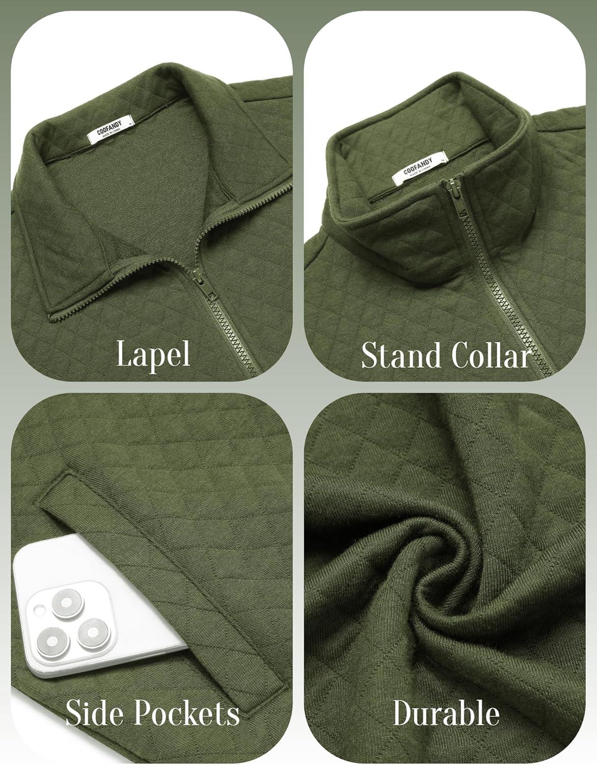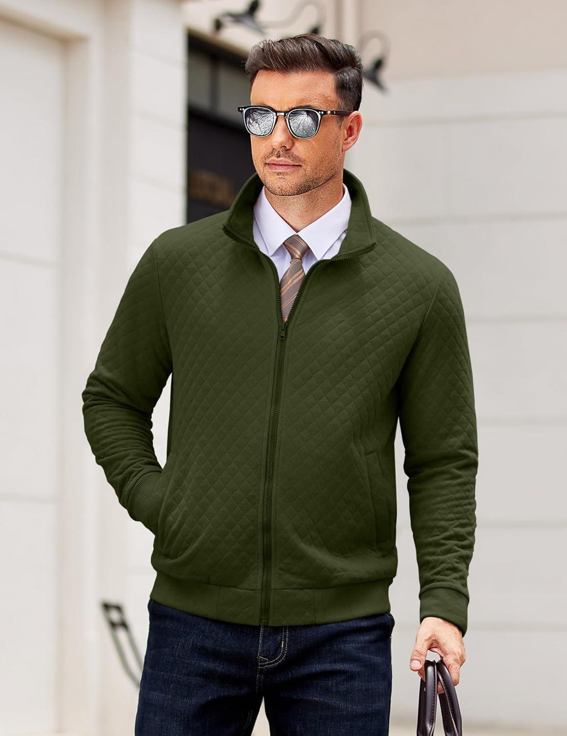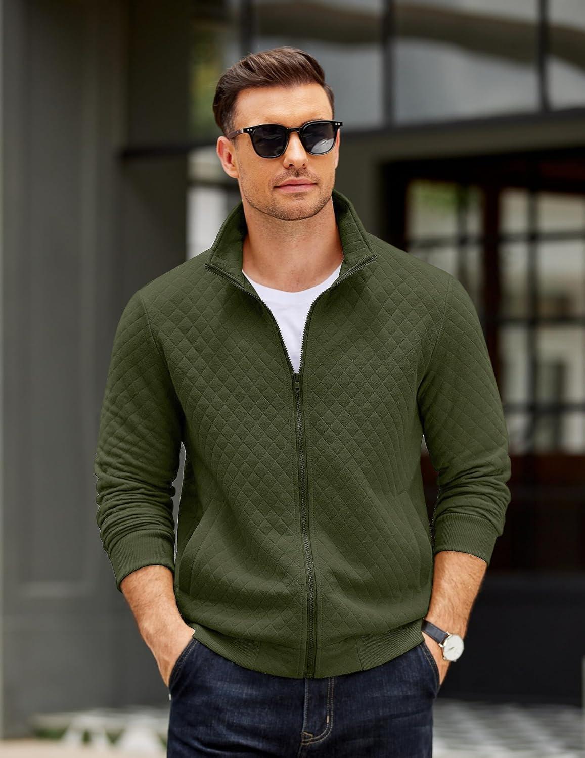 COOFANDY Mens Zip Up Sweatshirt Mock Neck Quilted Jacket Casual Lightweight Sweater Jackets with Pocket(Army Green)