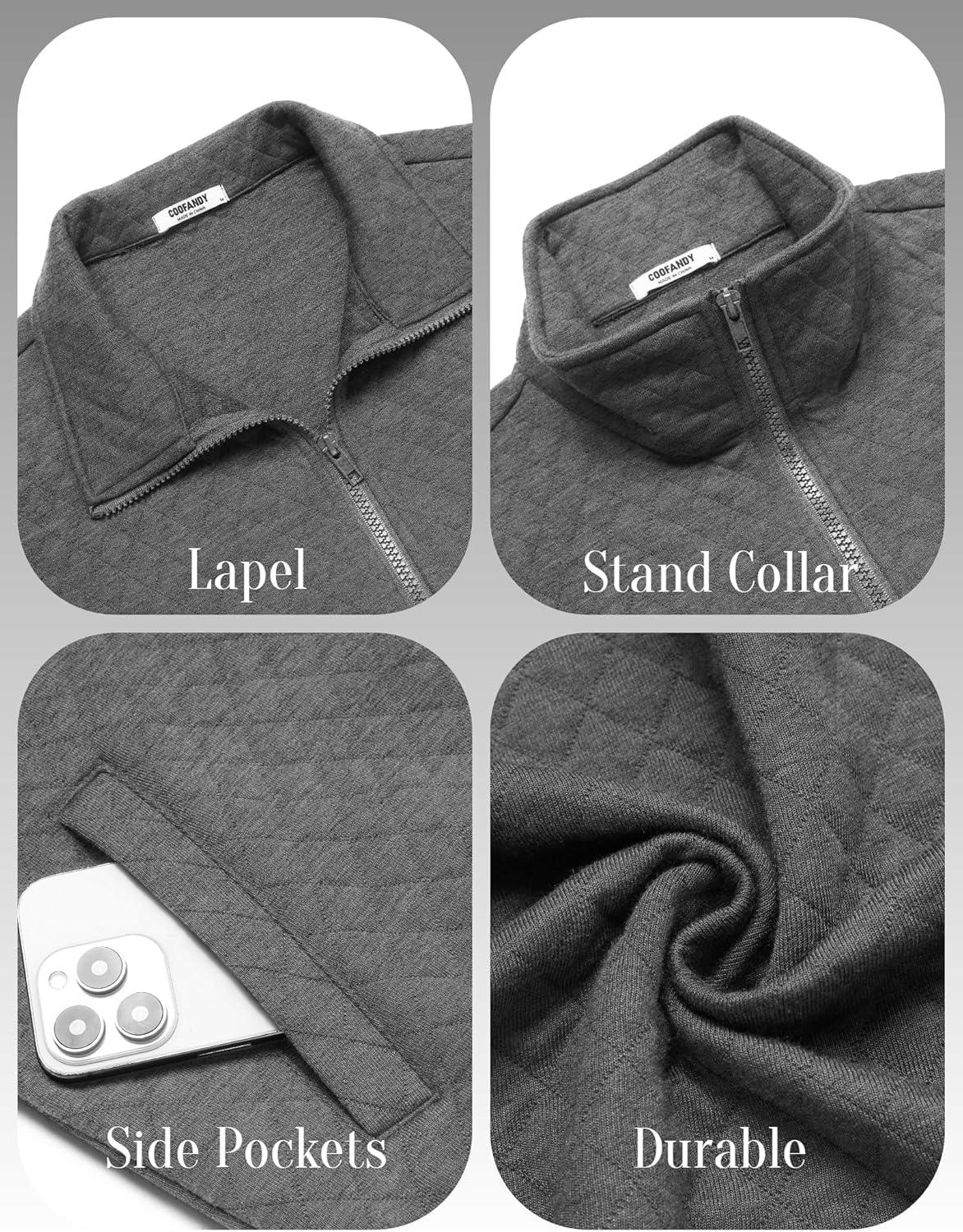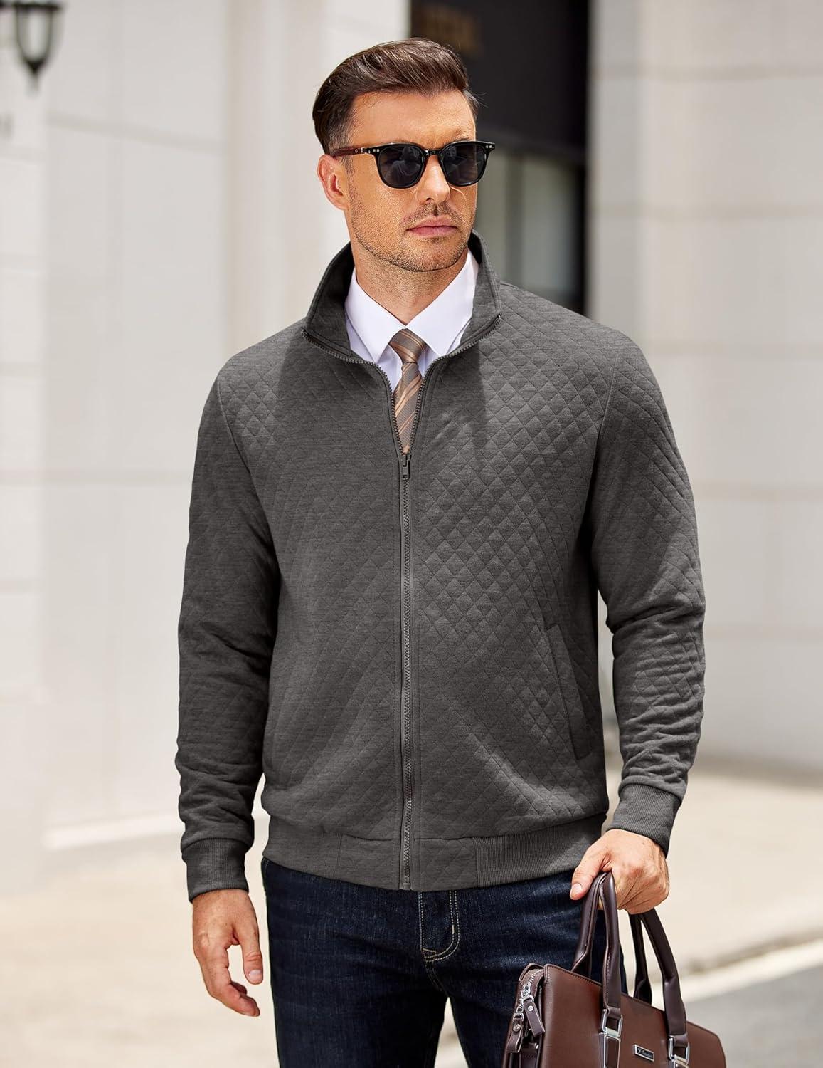 COOFANDY Mens Zip Up Sweatshirt Mock Neck Quilted Jacket Casual Lightweight Sweater Jackets with Pocket(Dark Grey)