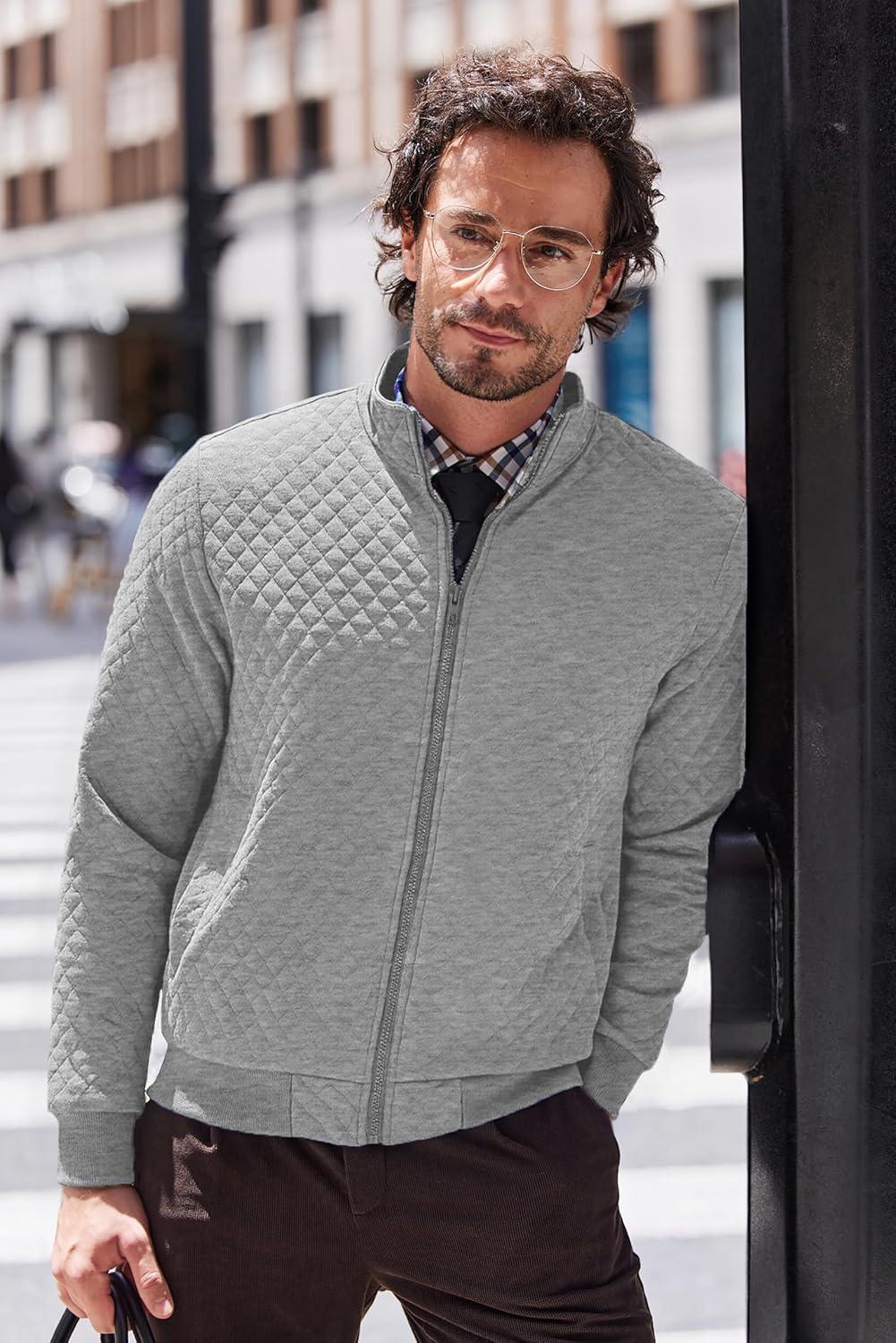 COOFANDY Mens Zip Up Sweatshirt Mock Neck Quilted Jacket Casual Lightweight Sweater Jackets with Pocket(Light Grey)