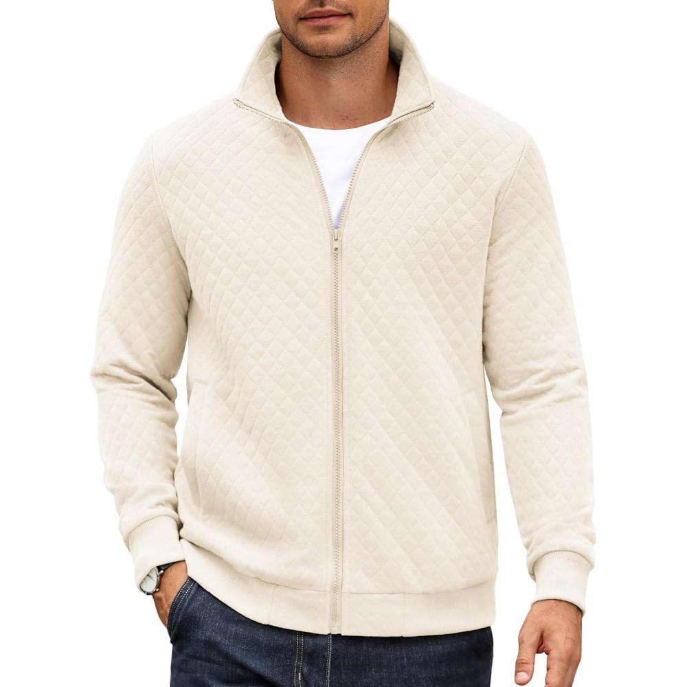 COOFANDY Mens Zip Up Sweatshirt Mock Neck Quilted Jacket Casual Lightweight Sweater Jackets with Pocket(White)