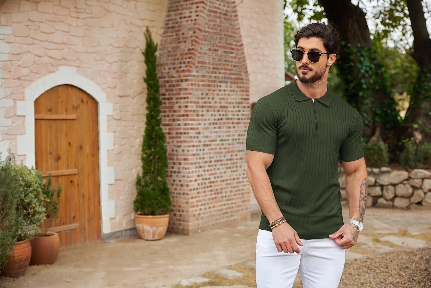 COOFANDY Men’s Zipper Polo Shirt Casual Knit Short Sleeve Polo T Shirt Classic Fit Shirts(Army Green)