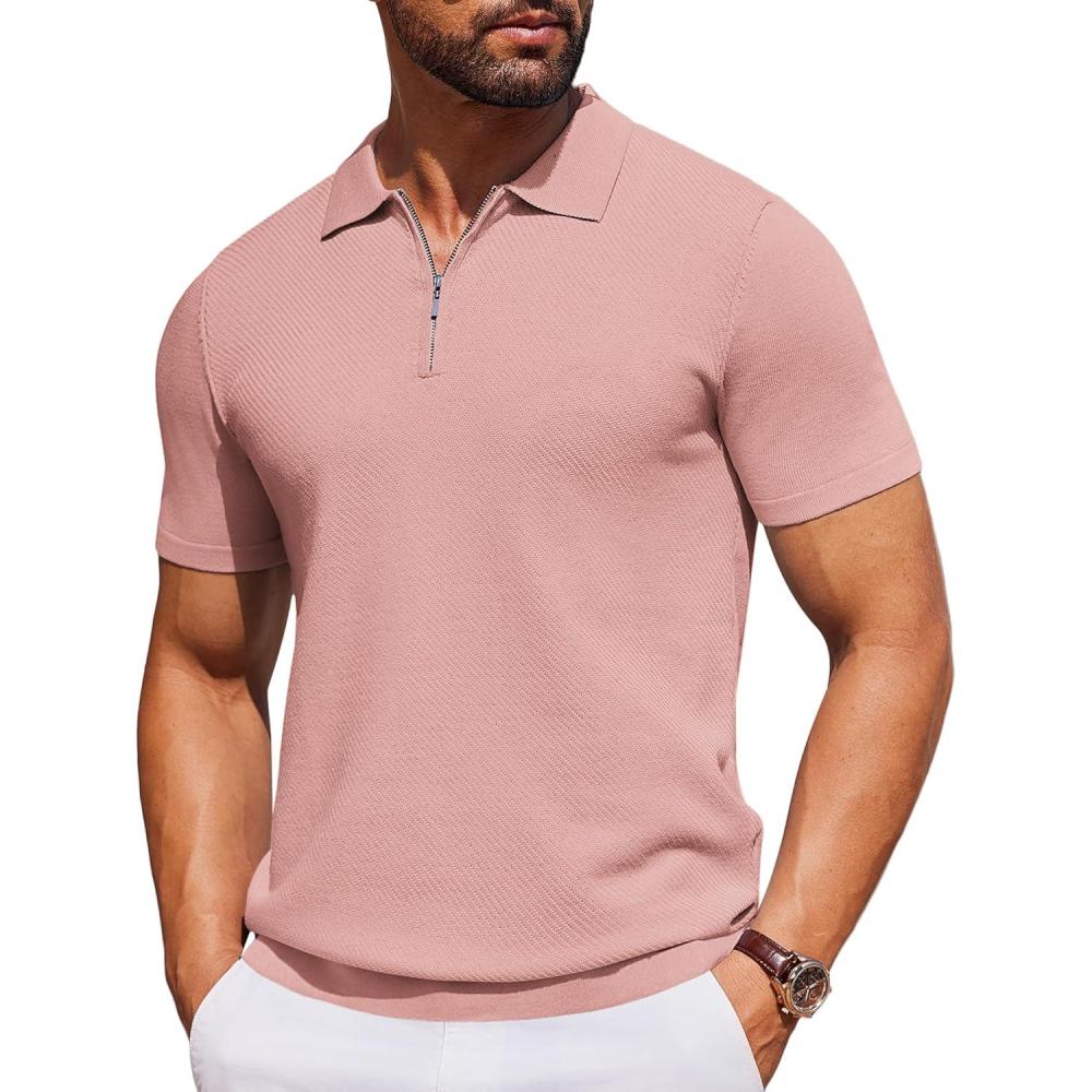 COOFANDY Men’s Zipper Polo Shirt Casual Knit Short Sleeve Polo T Shirt Classic Fit Shirts(Light Pink)