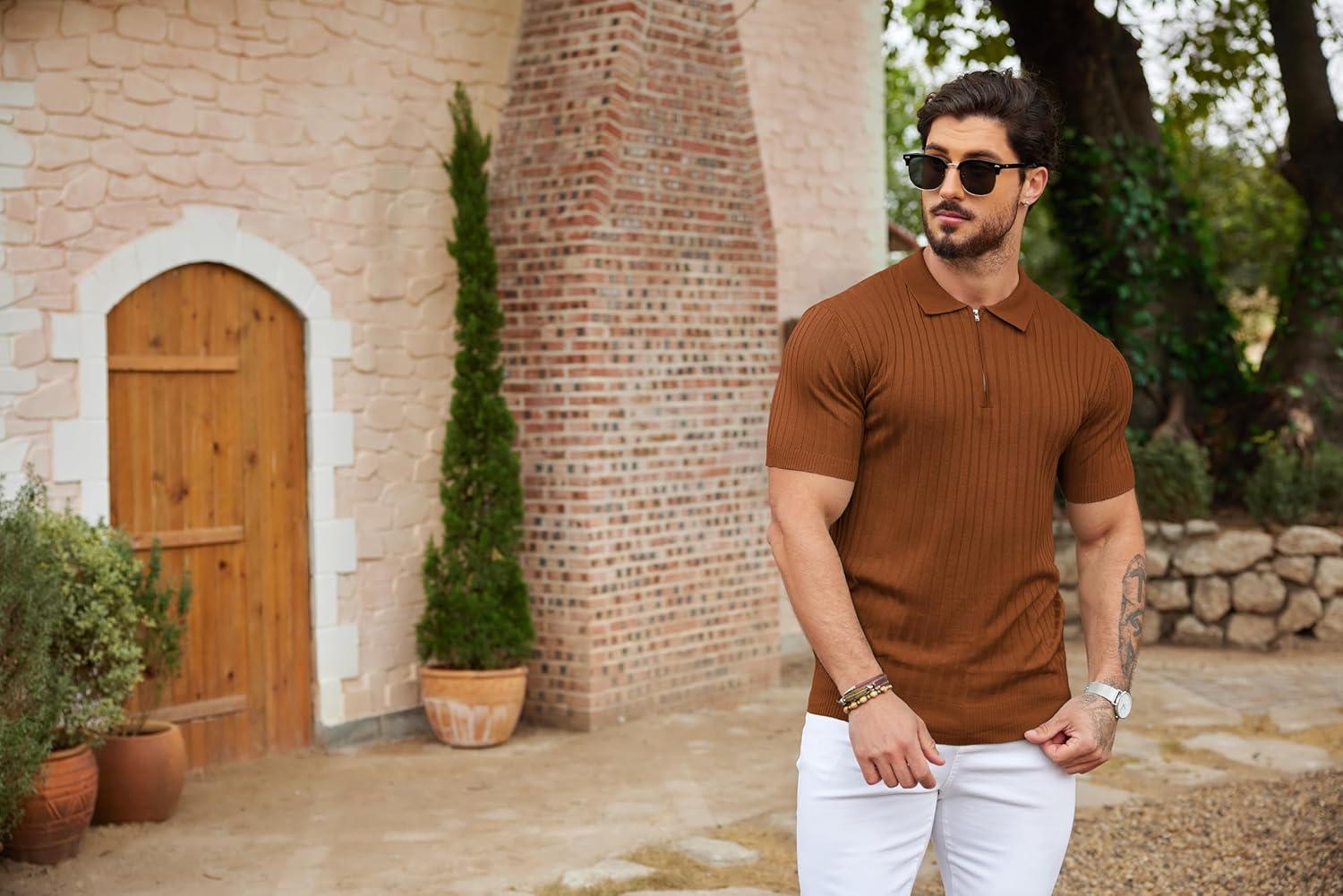 COOFANDY Men’s Zipper Polo Shirts Short Sleeve Ribbed Knit Polo T Shirts Fashion Casual Golf Shirts