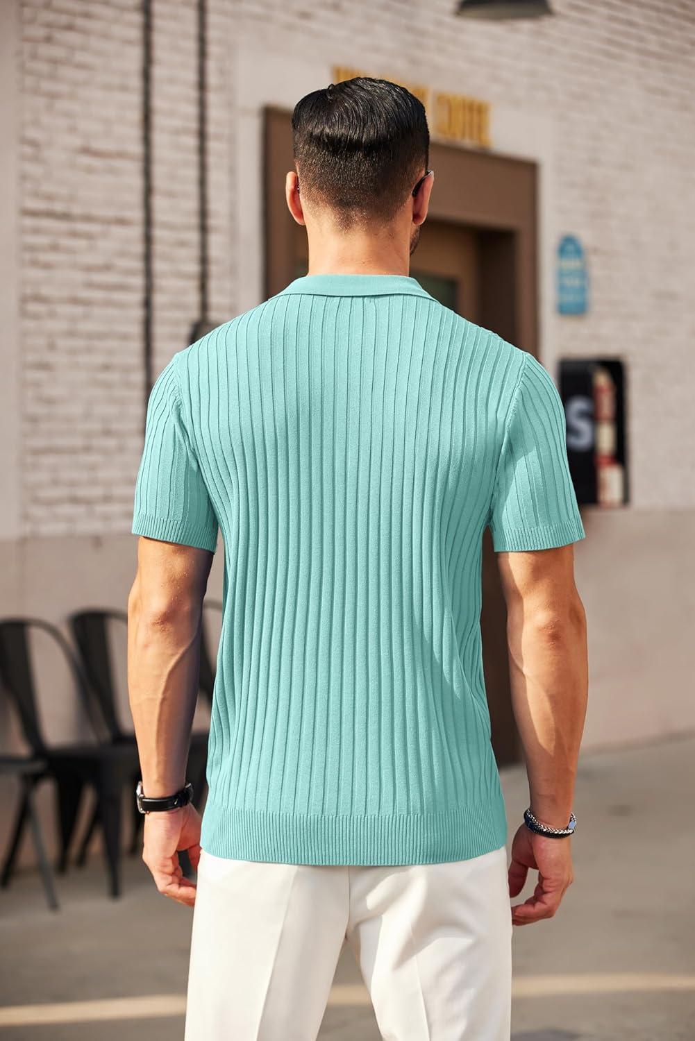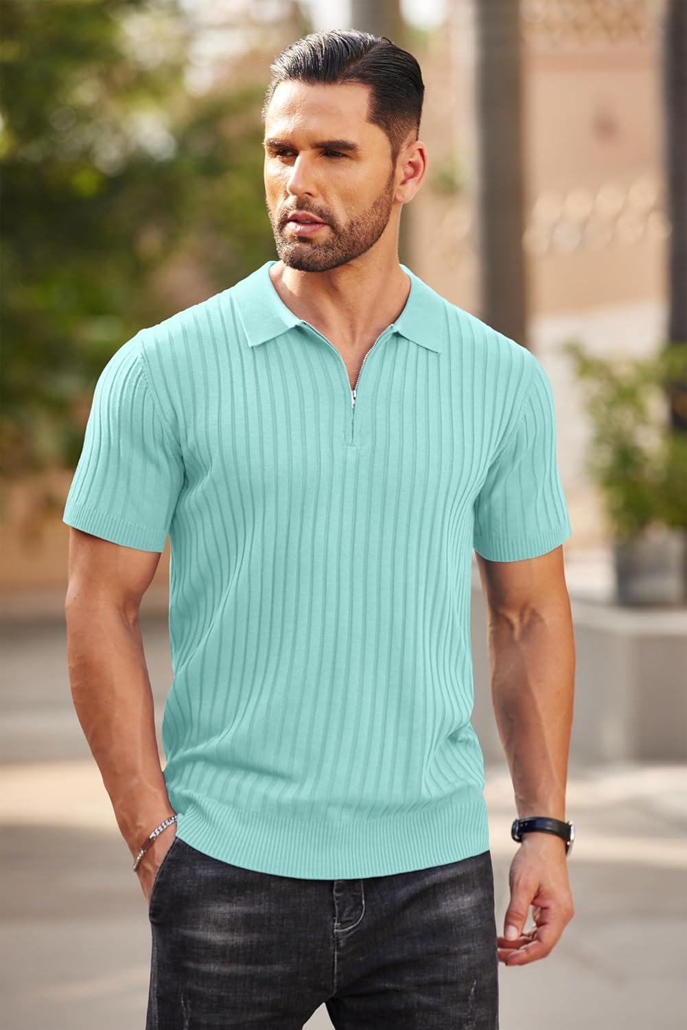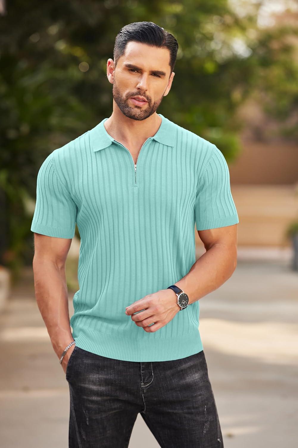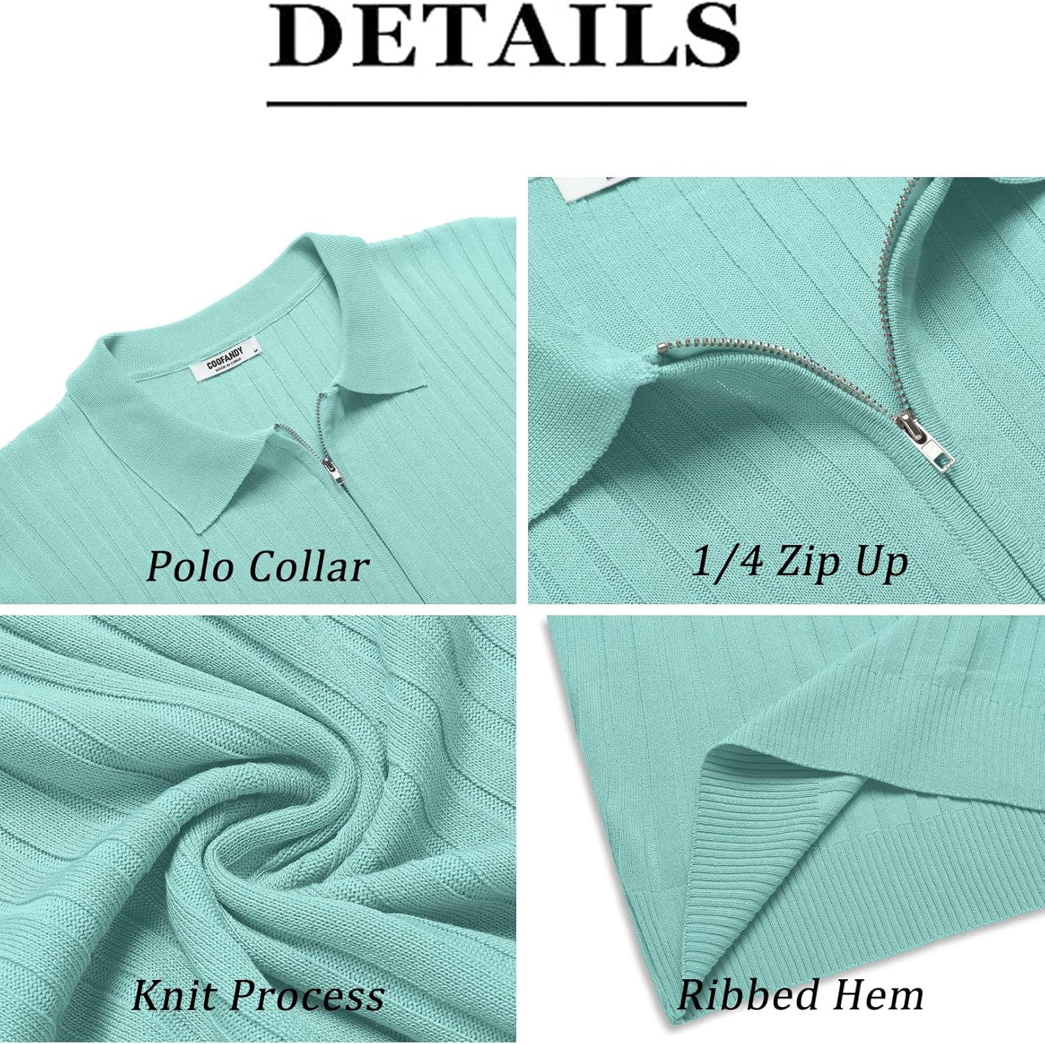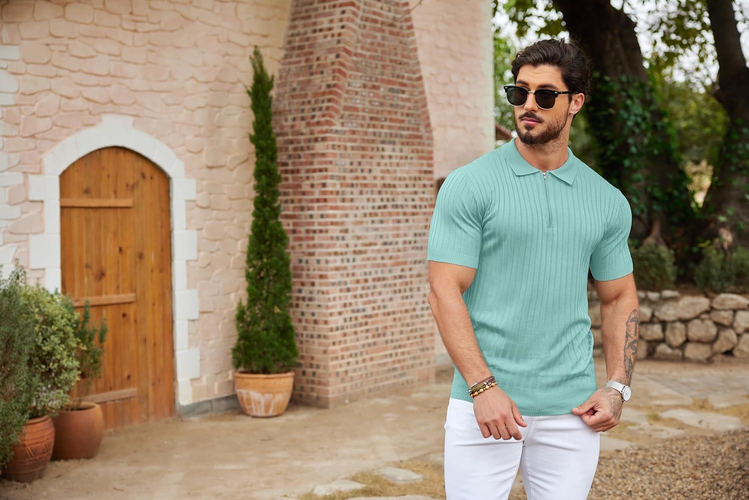 COOFANDY Men’s Zipper Polo Shirts Short Sleeve Ribbed Knit Polo T Shirts Fashion Casual Golf Shirts(Green)