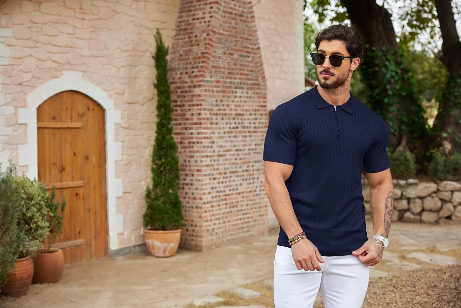 COOFANDY Men’s Zipper Polo Shirts Short Sleeve Ribbed Knit Polo T Shirts Fashion Casual Golf Shirts(Navy Blue)