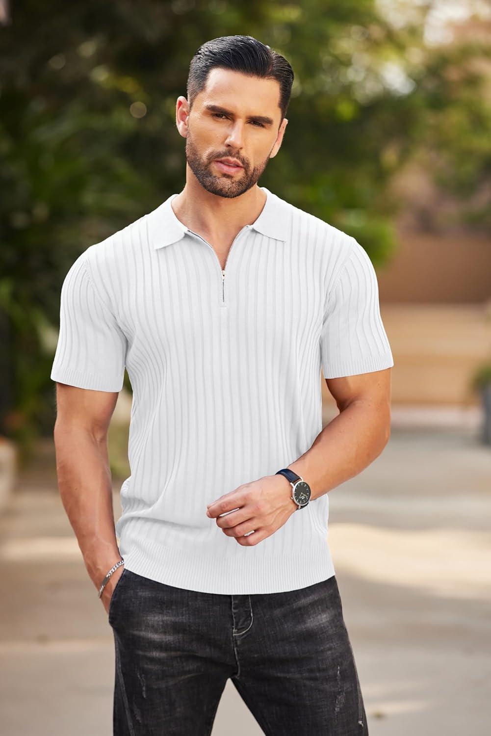 COOFANDY Men’s Zipper Polo Shirts Short Sleeve Ribbed Knit Polo T Shirts Fashion Casual Golf Shirts(White)