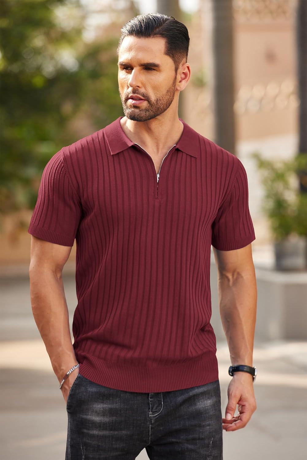 COOFANDY Men’s Zipper Polo Shirts Short Sleeve Ribbed Knit Polo T Shirts Fashion Casual Golf Shirts(Wine Red)