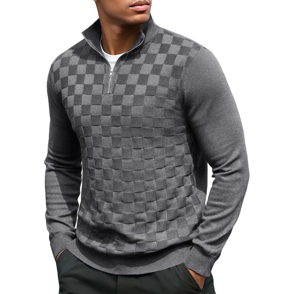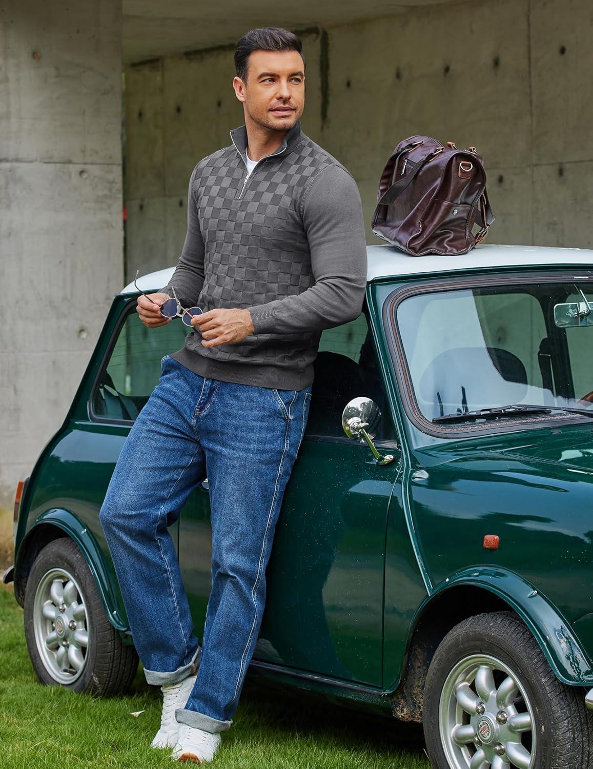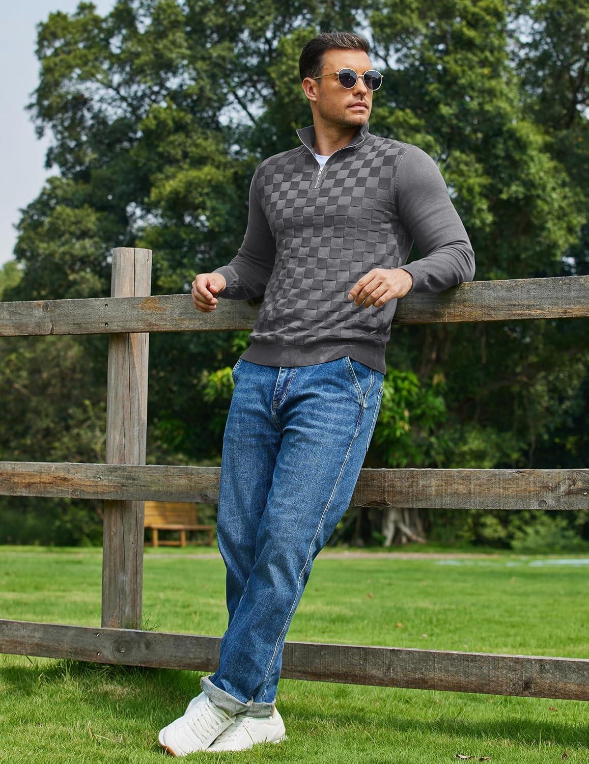 COOFANDY Quarter Zip Pullover Men Dress Sweaters Long Sleeve Jacquard Checkered Sweater(Deep Grey)