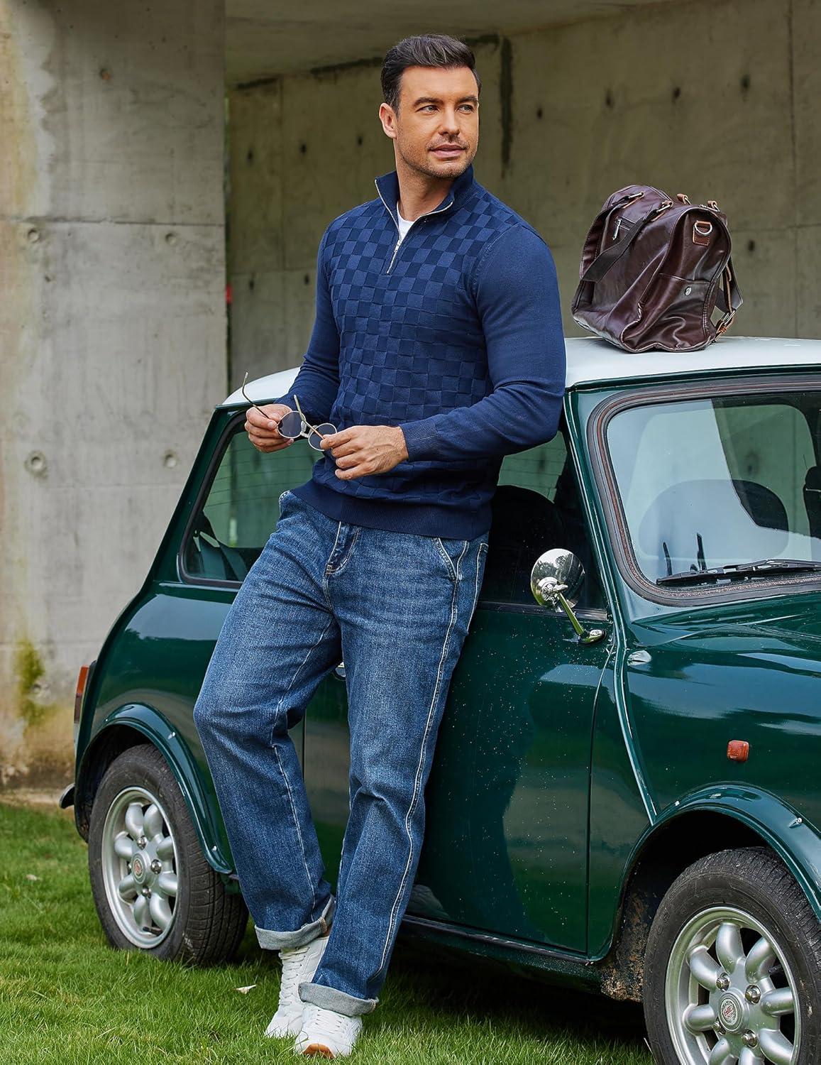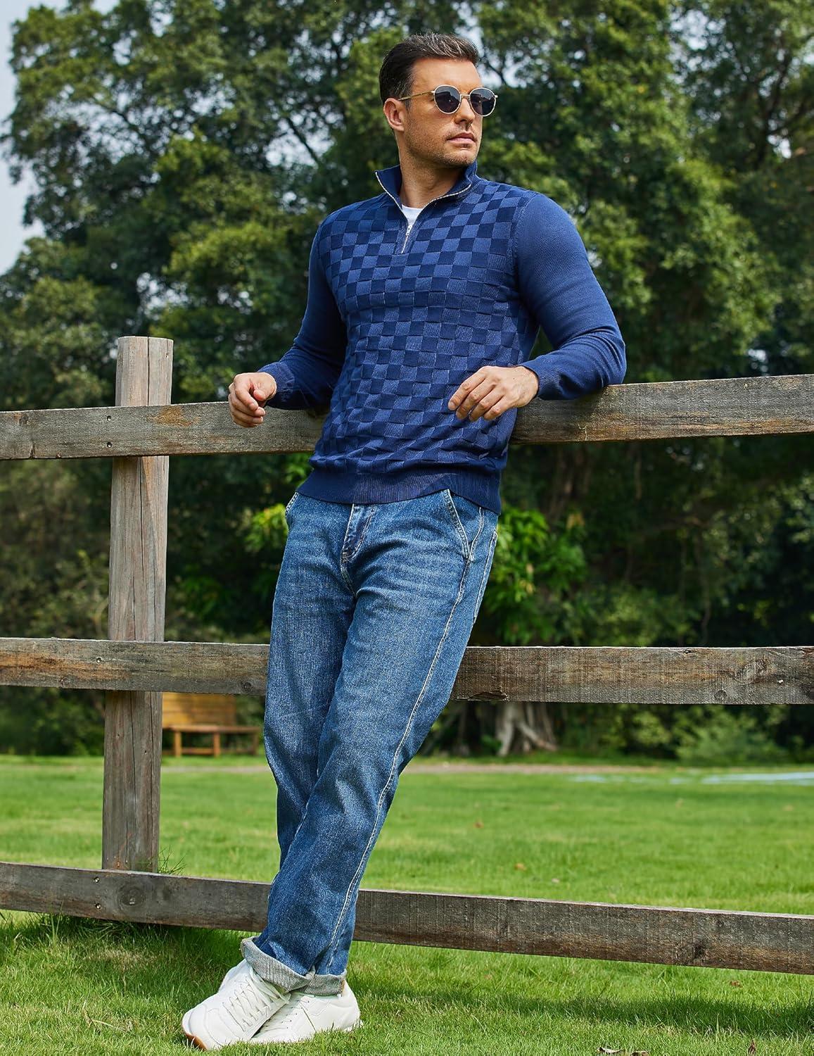 COOFANDY Quarter Zip Pullover Men Dress Sweaters Long Sleeve Jacquard Checkered Sweater(Navy Blue)