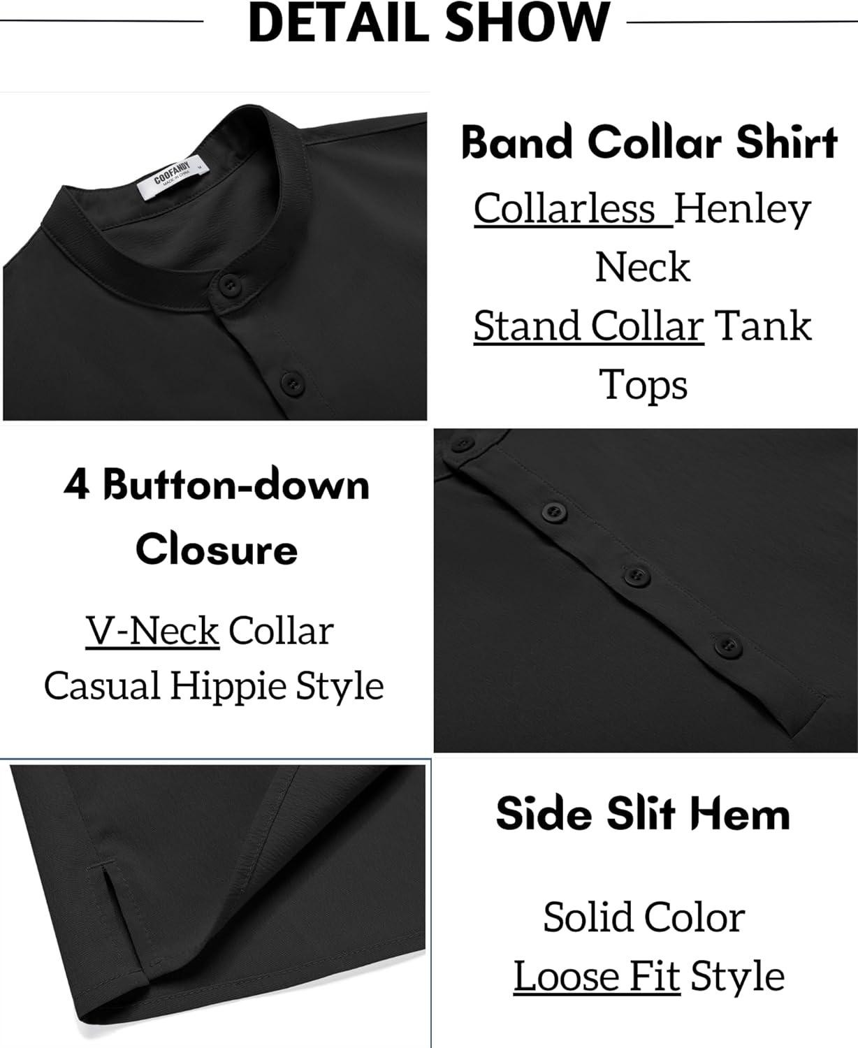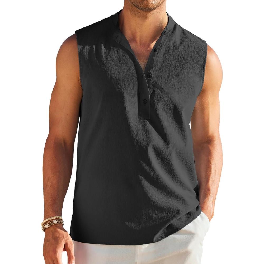 COOFANDY Mens Sleeveless Beach Shirts Casual Tank Tops Summer Button up Henley ShirtsProduct Feature: Sleeveless henley shirts for men, made of soft and comfortable fabric, feature with skin friendly, lightweight, breathable, wrinkle free and no need to iron, which can provide you comfort all the time. Brand: COOFANDY provide casual menswear and best customer experience. Providing Premium Quality, Great fabric for everyday outlook, Stylish design. Main Features:Color:Black, White, Navy Blue, Light Blue, Light Brown, Light GreySeason: Spring,Summer,FallDesign: Men tank top, band collar, solid color, button-down closure, Sleeveless. The sleeveless design allows air to circulate, preventing overheating and ensuring maximum comfort.Fit Style:RegularOccasions:This beach tank top is perfectly suitable for various occasions like beach, wedding, party, vacation, travel, cruises, camping, birthday, festival, lounging, yoga, meditation or daily casual wear. Also, it will be a good gift for your father, brother, boyfriend, husband, son or other male friends.Garment Care: Machine and hand wash are both available for the sleeveless hippie shirts. We recommend to buy one size bigger for loose, comfortable fit.