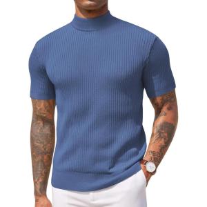 COOFANDY Men’s Mock Turtleneck Sweater Short Sleeve Casual Basic Tops Ribbed Knit Pullover Solid Tee(Grey Blue)