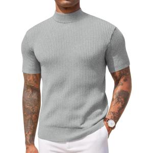 COOFANDY Men’s Mock Turtleneck Sweater Short Sleeve Casual Basic Tops Ribbed Knit Pullover Solid Tee(Light Grey)