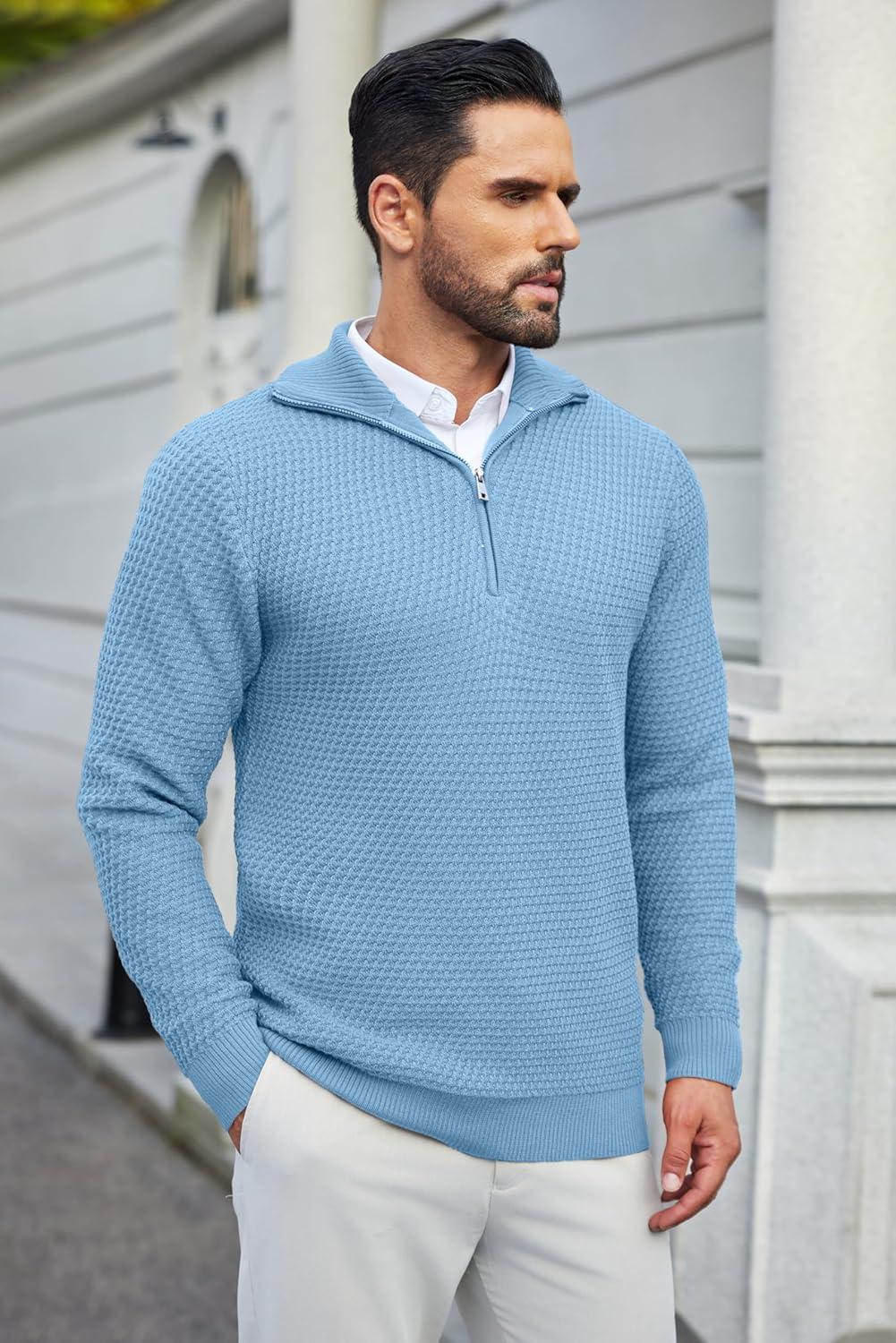COOFANDY Mens Quarter Zip Pullover Quilted Sweatshirt Knit Long Sleeve Sweater Half Zip Polo Sweatshirts with Pocket(Light Blue)
