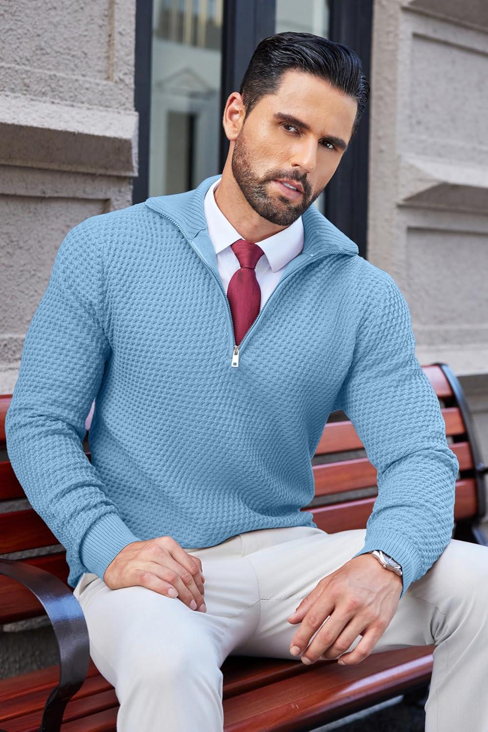 COOFANDY Mens Quarter Zip Pullover Slim Fit Lightweight Knit Pullover Sweaters Casual Polo Sweater(Blue)