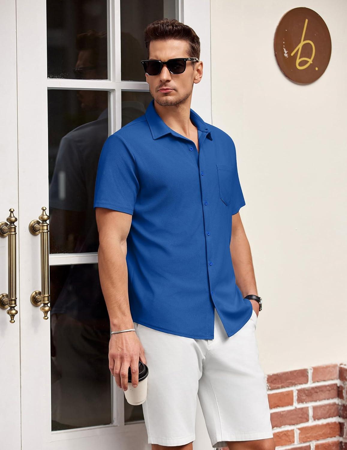 COOFANDY Men’s Short Sleeve Button Down Shirt Casual Summer Beach Shirt Waffle Knit Shirts Wrinkle Free Untucked Shirt(Blue)