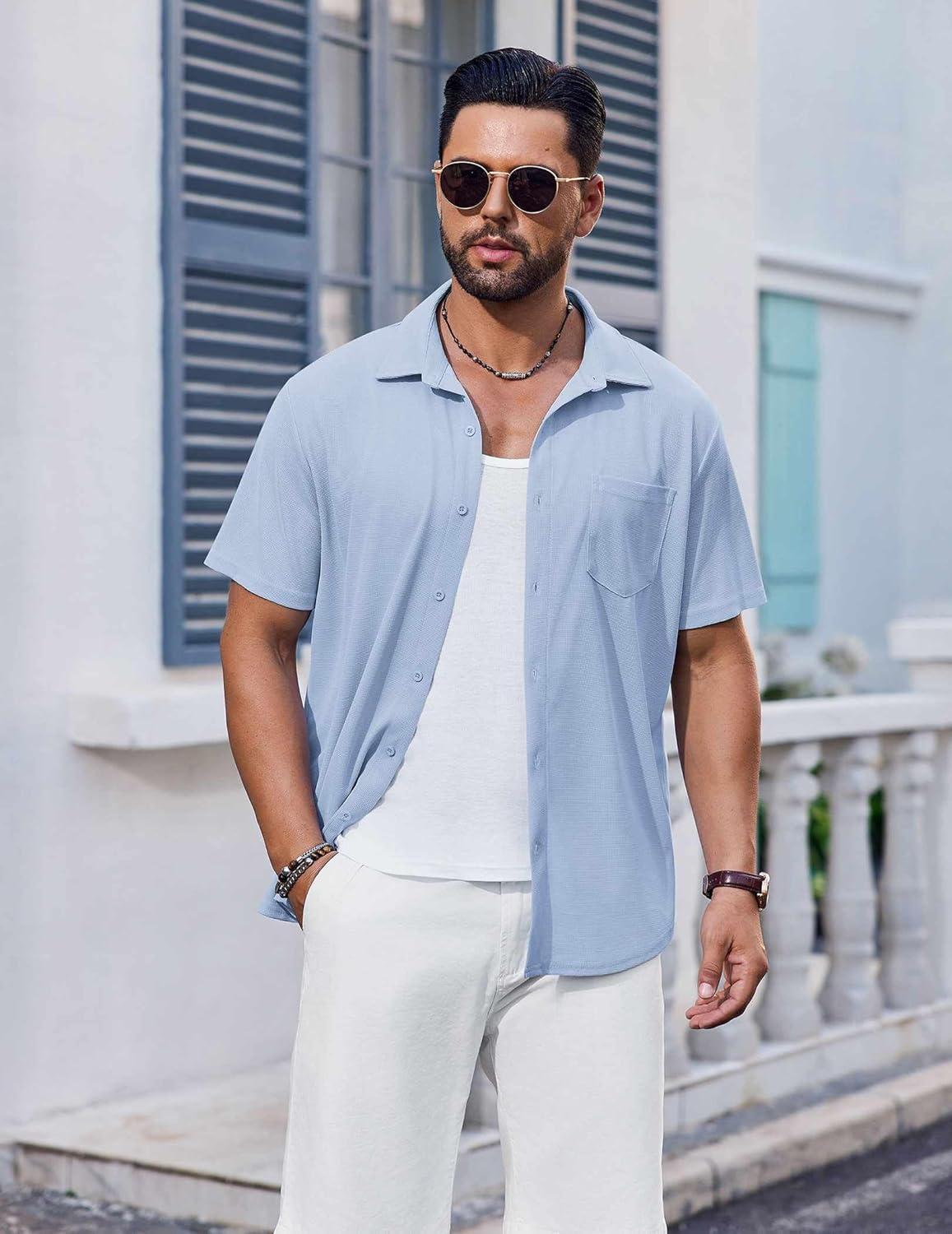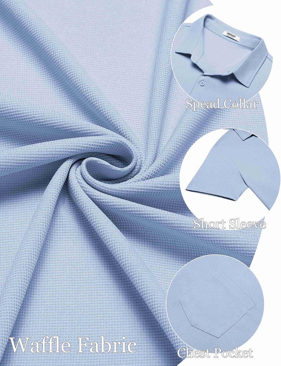 COOFANDY Men’s Short Sleeve Button Down Shirt Casual Summer Beach Shirt Waffle Knit Shirts Wrinkle Free Untucked Shirt(Light Blue)