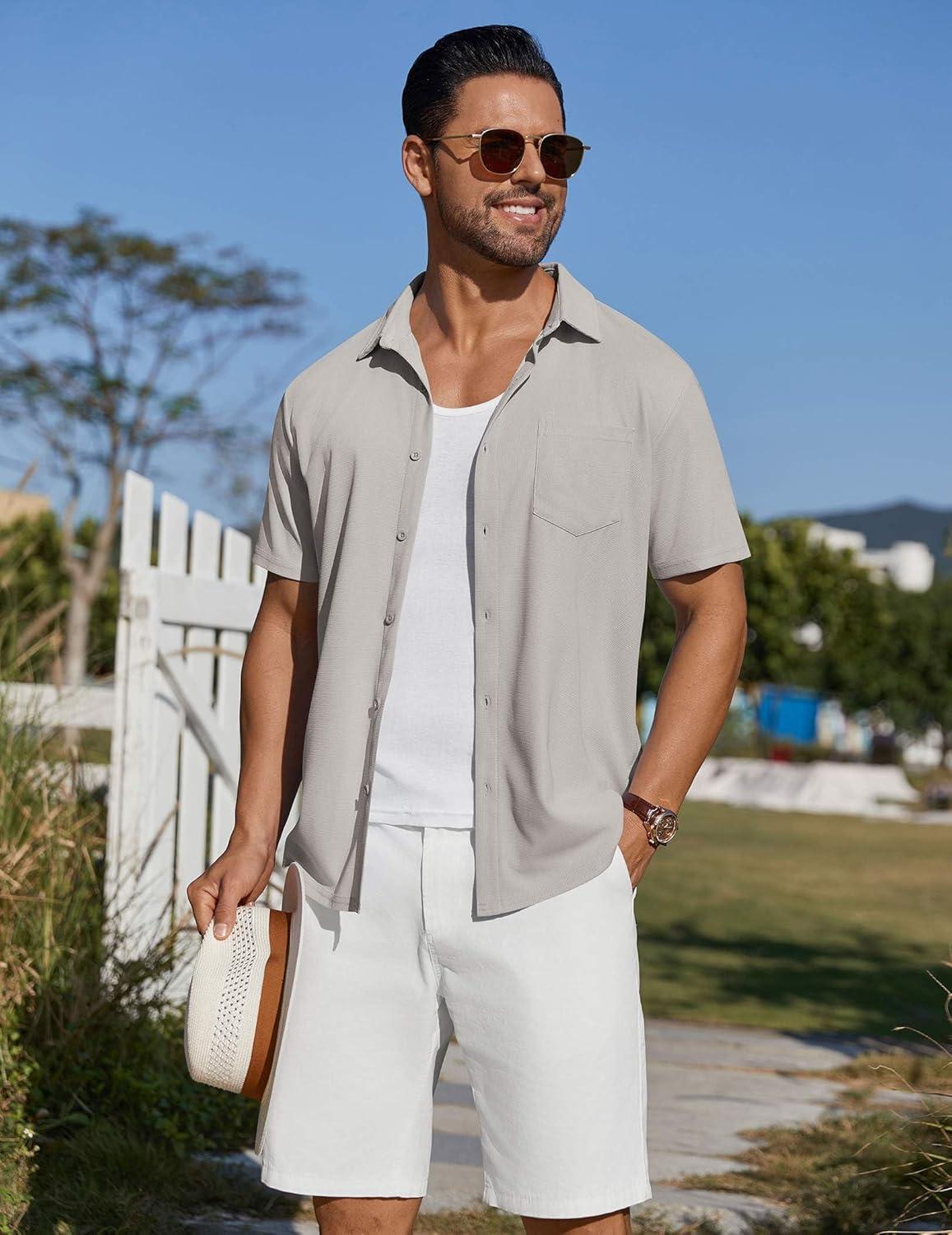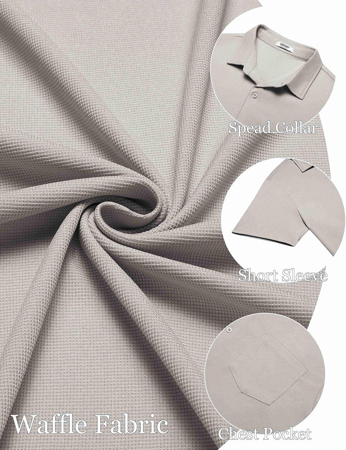 COOFANDY Men’s Short Sleeve Button Down Shirt Casual Summer Beach Shirt Waffle Knit Shirts Wrinkle Free Untucked Shirt(Light Grey)