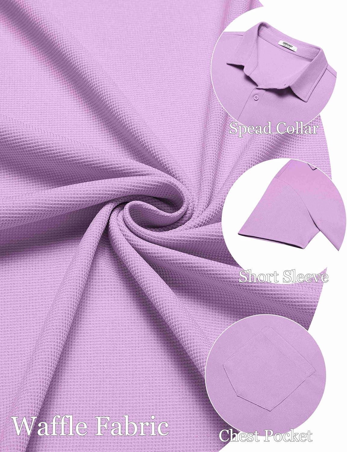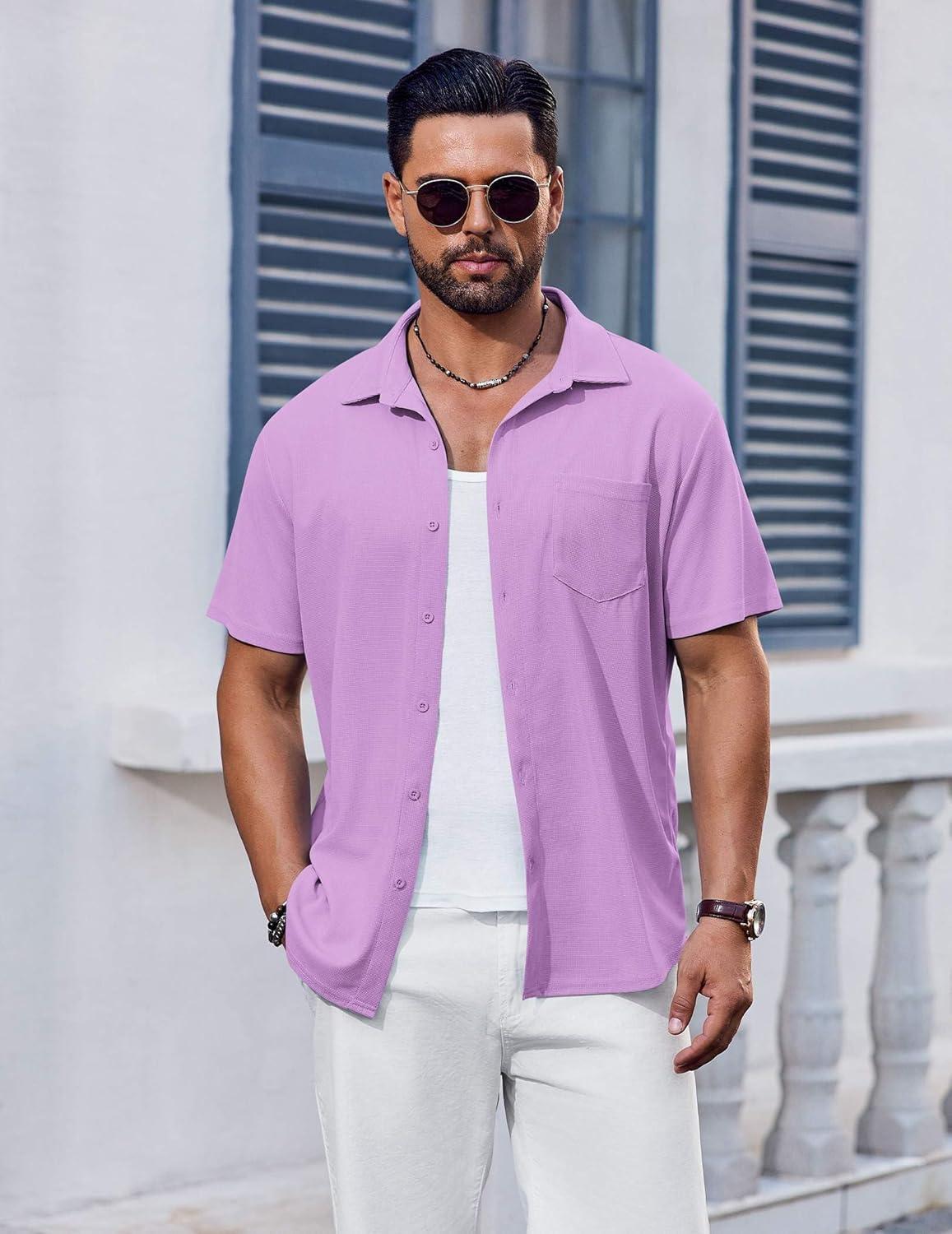 COOFANDY Men’s Short Sleeve Button Down Shirt Casual Summer Beach Shirt Waffle Knit Shirts Wrinkle Free Untucked Shirt(Light Purple)