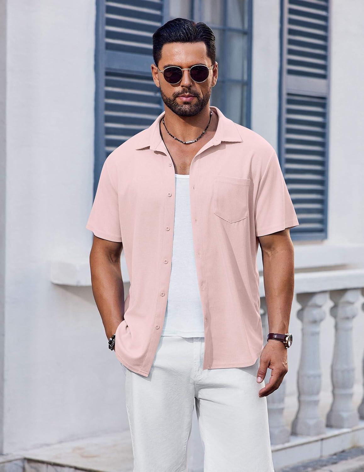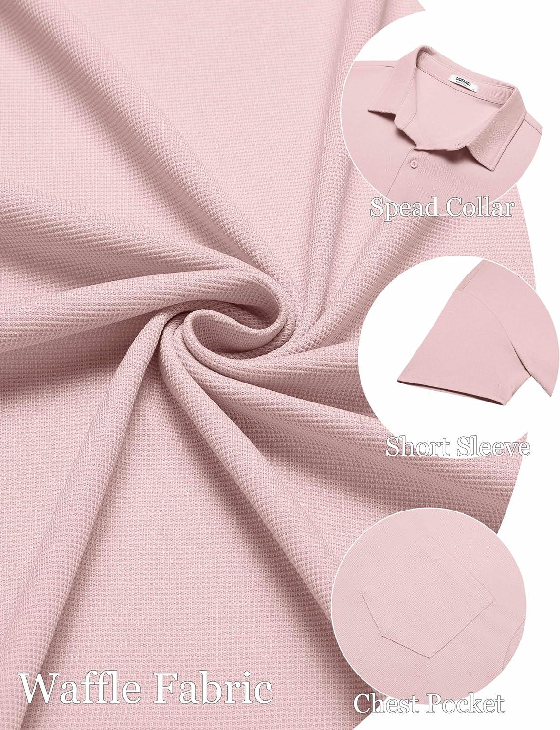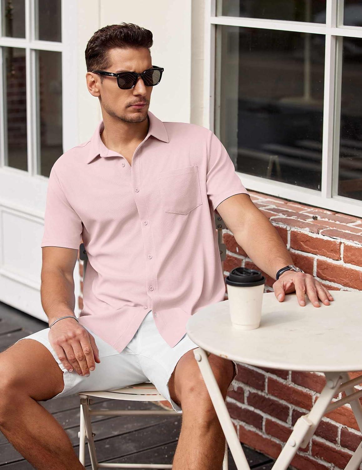 COOFANDY Men’s Short Sleeve Button Down Shirt Casual Summer Beach Shirt Waffle Knit Shirts Wrinkle Free Untucked Shirt(Pink)