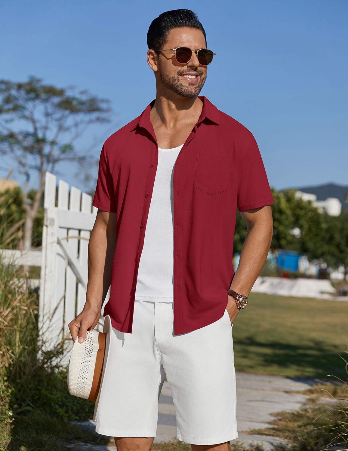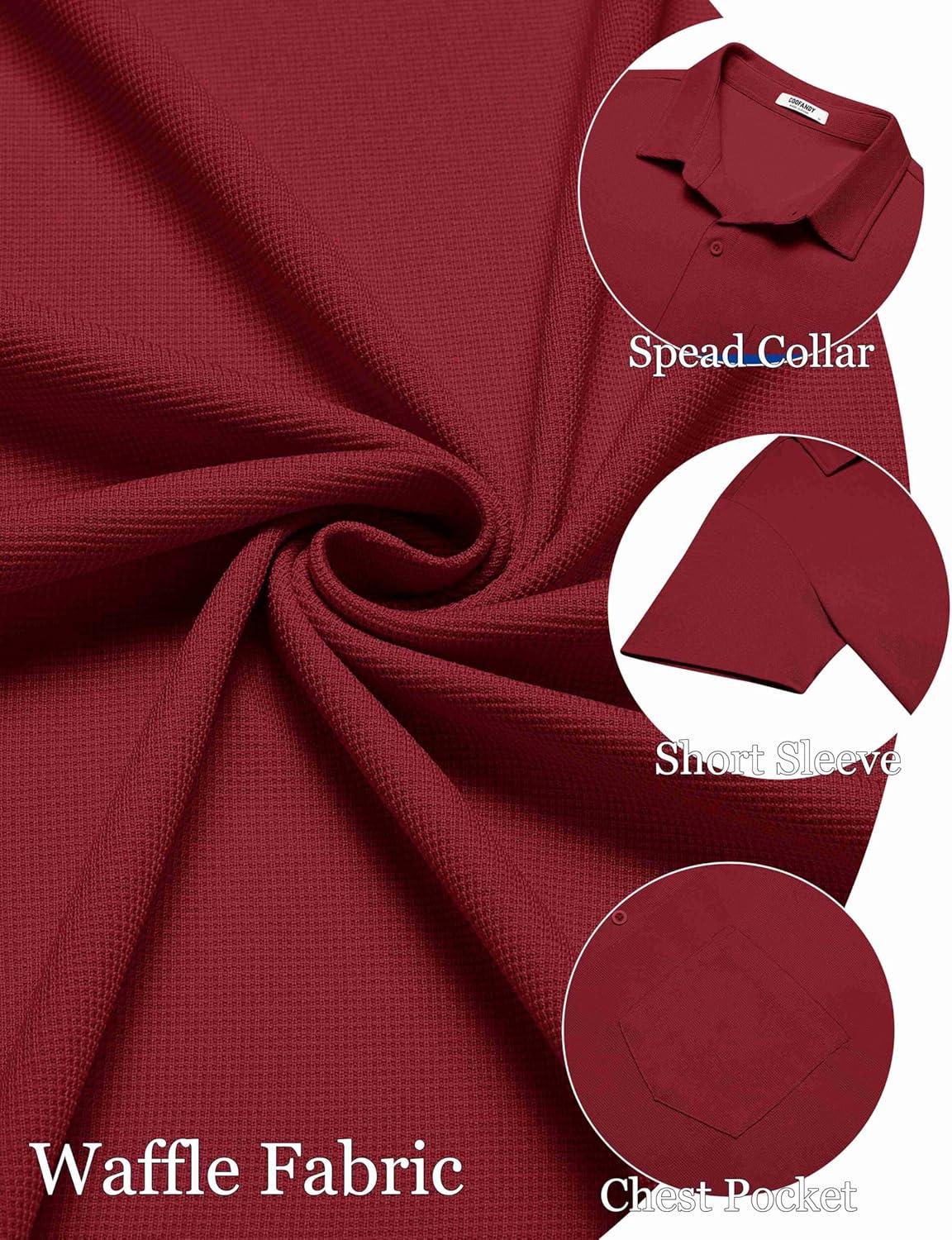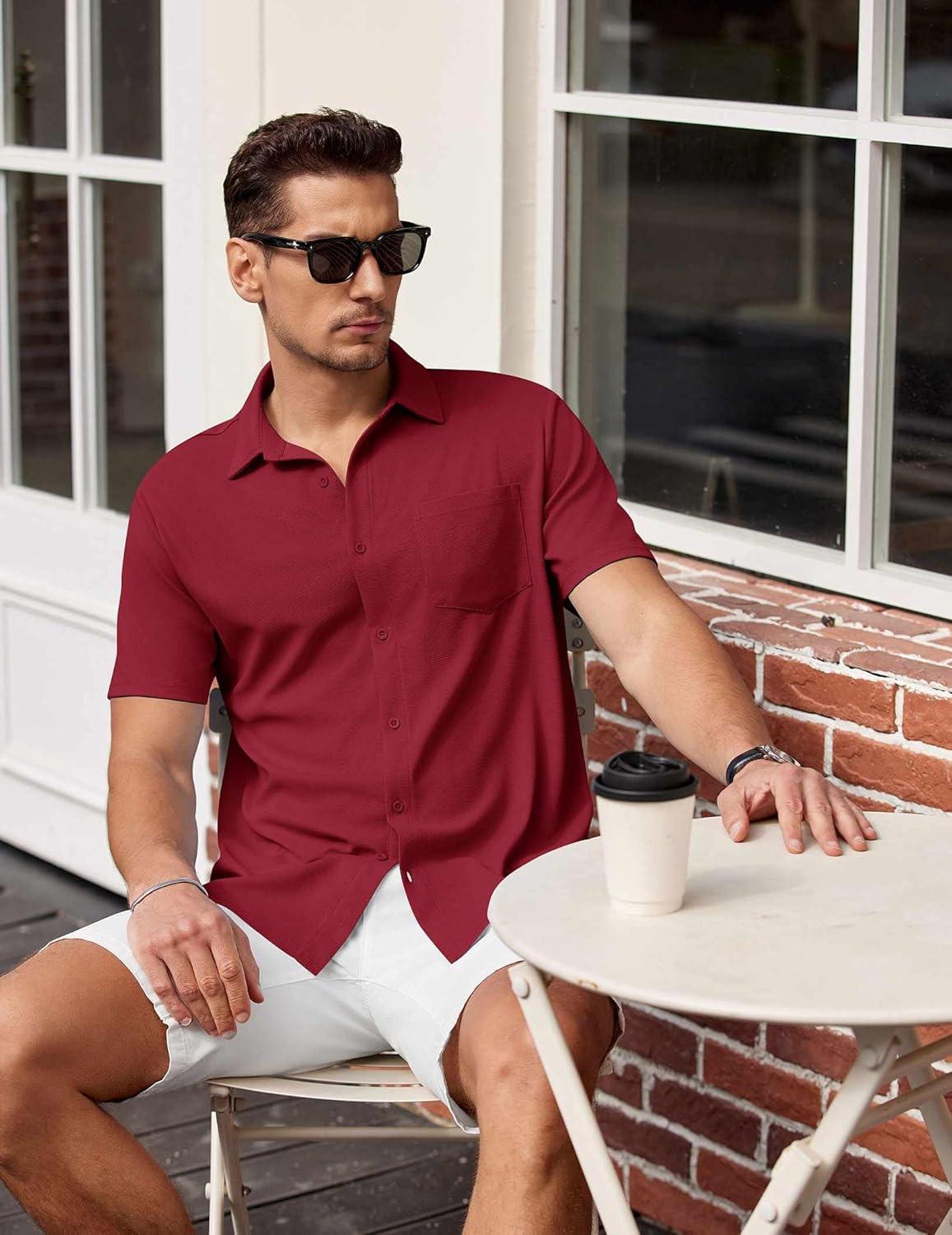 COOFANDY Men’s Short Sleeve Button Down Shirt Casual Summer Beach Shirt Waffle Knit Shirts Wrinkle Free Untucked Shirt(Wine Red)