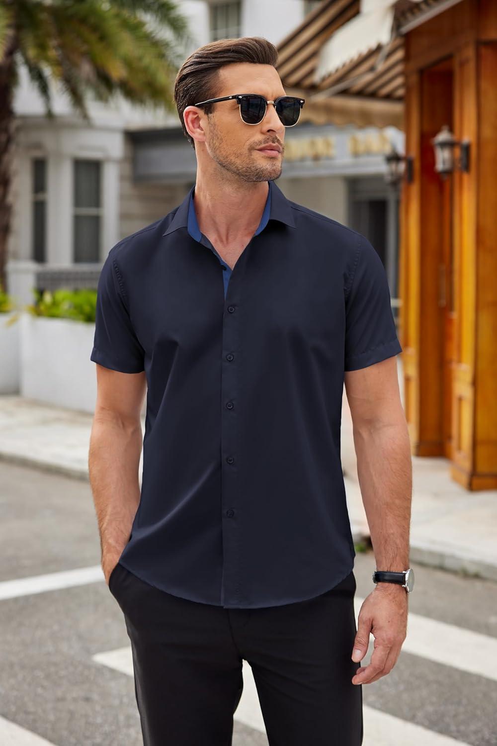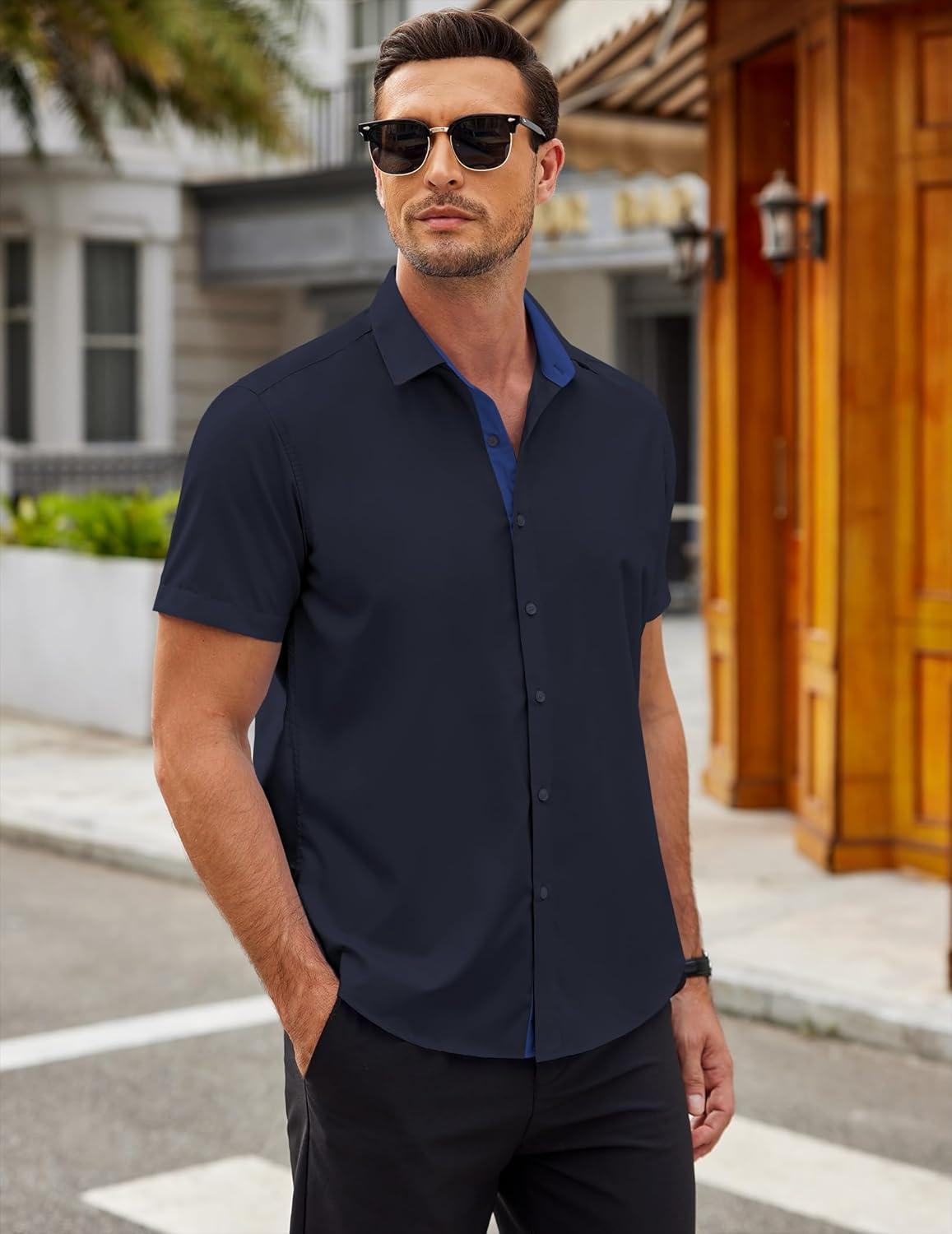 COOFANDY Men’s Short Sleeve Button Down Shirts Casual Summer Dress Untucked Shirts(Dark Blue)