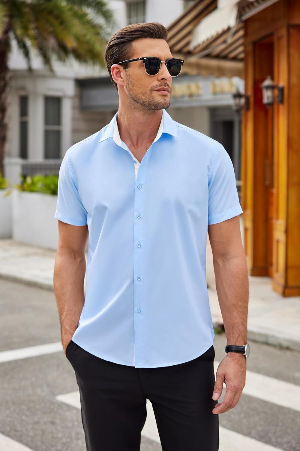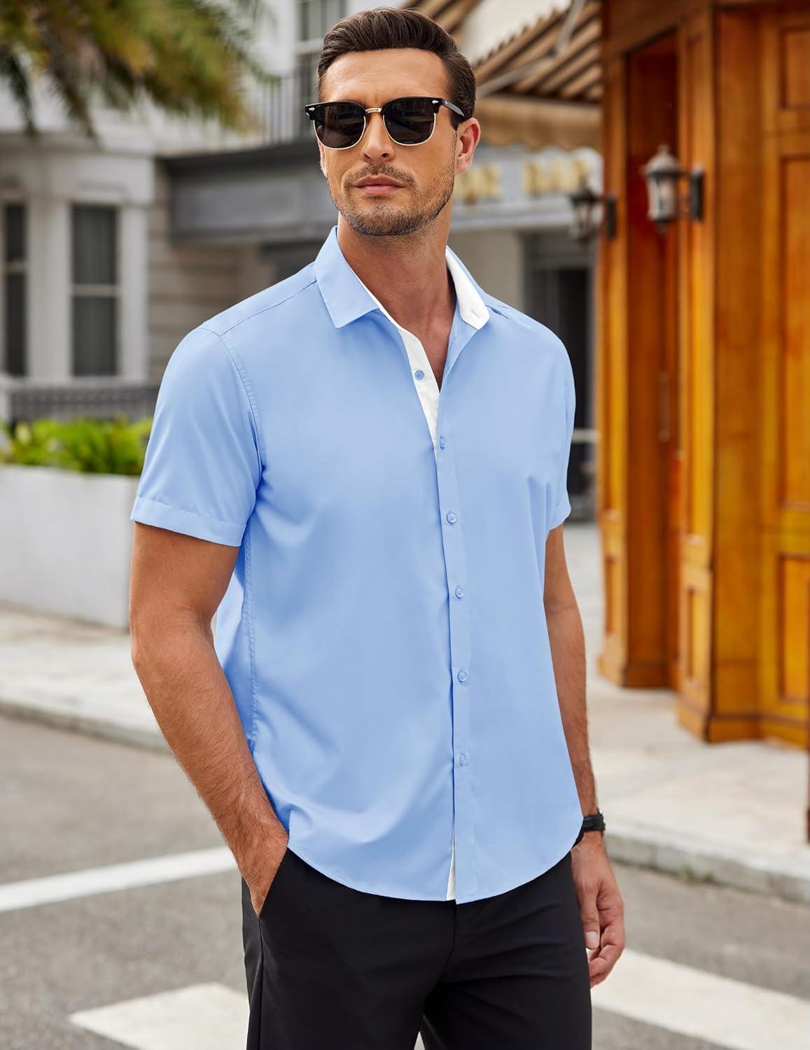 COOFANDY Men’s Short Sleeve Button Down Shirts Casual Summer Dress Untucked Shirts(Light Blue)