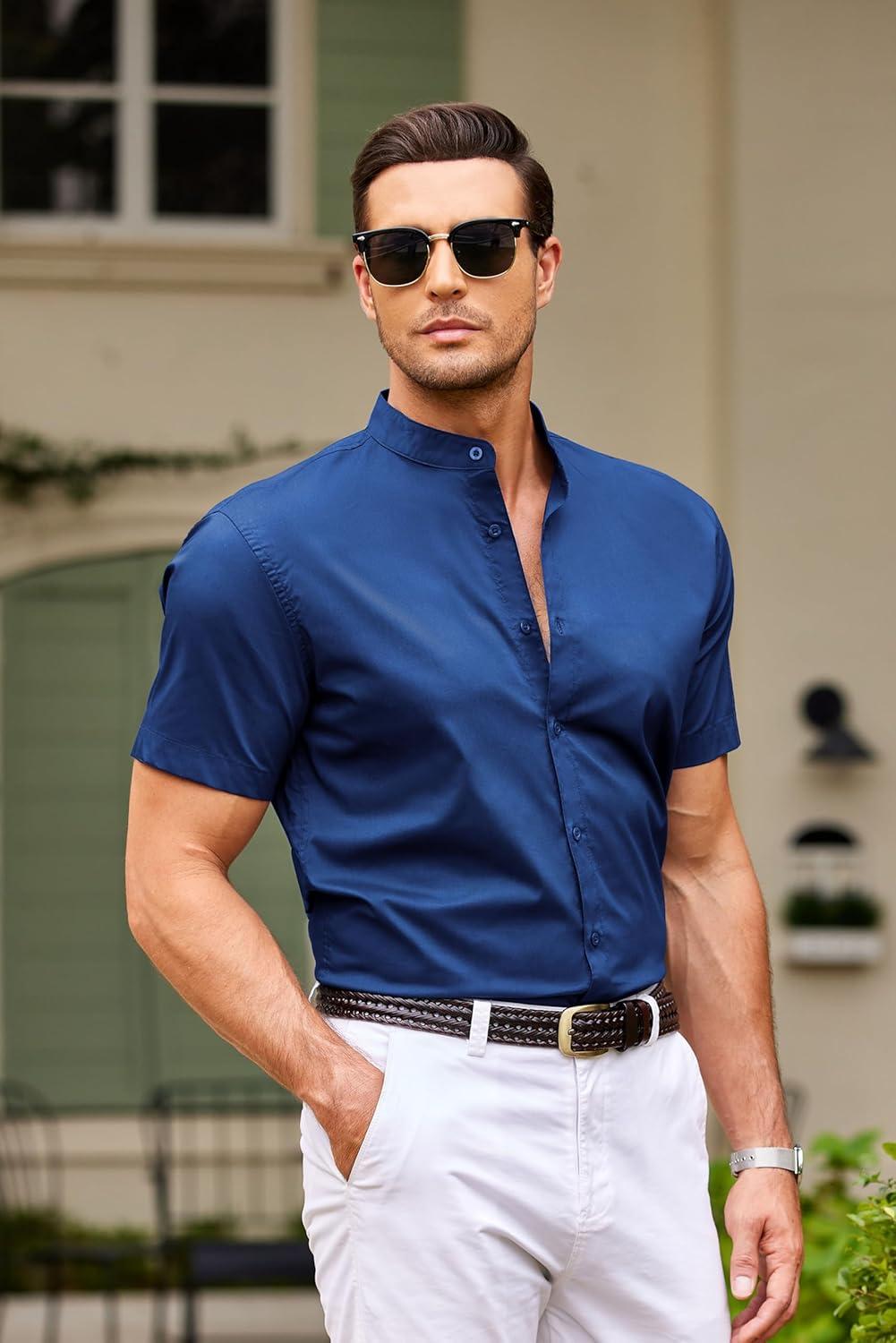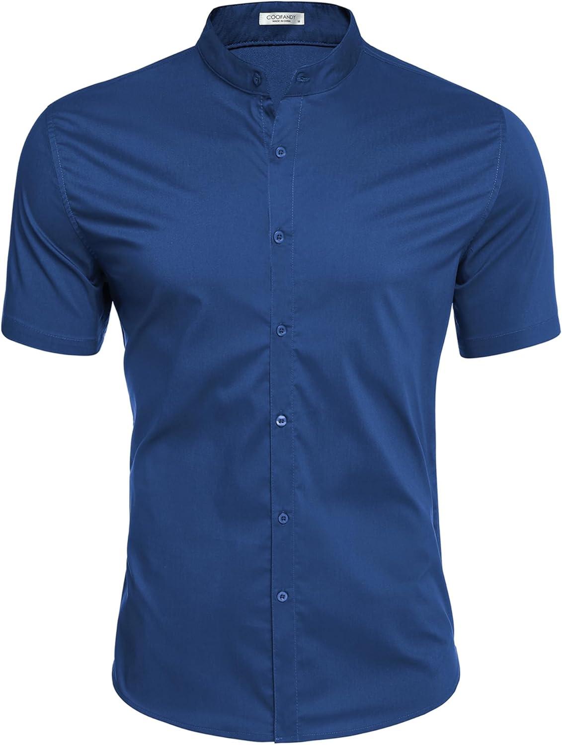 COOFANDY Muscle Fit Dress Shirts for Men Banded Collar Casual Button Down Shirts(Blue)