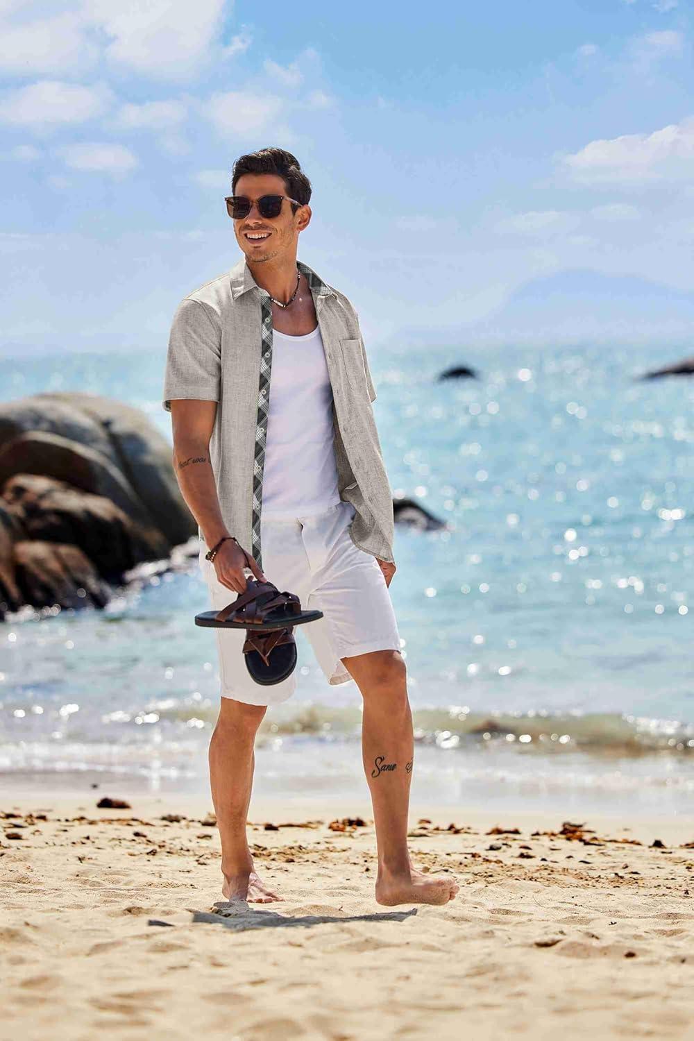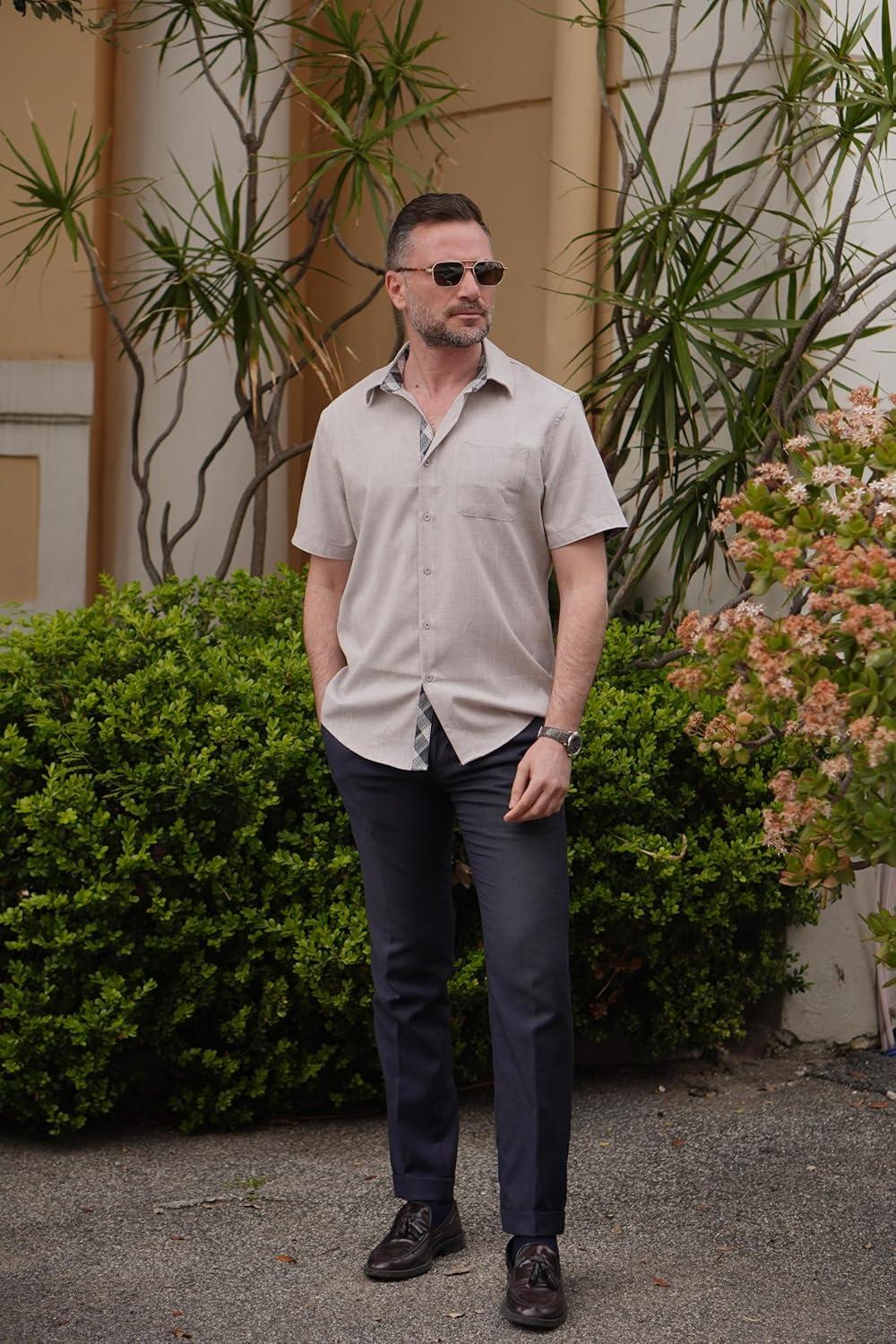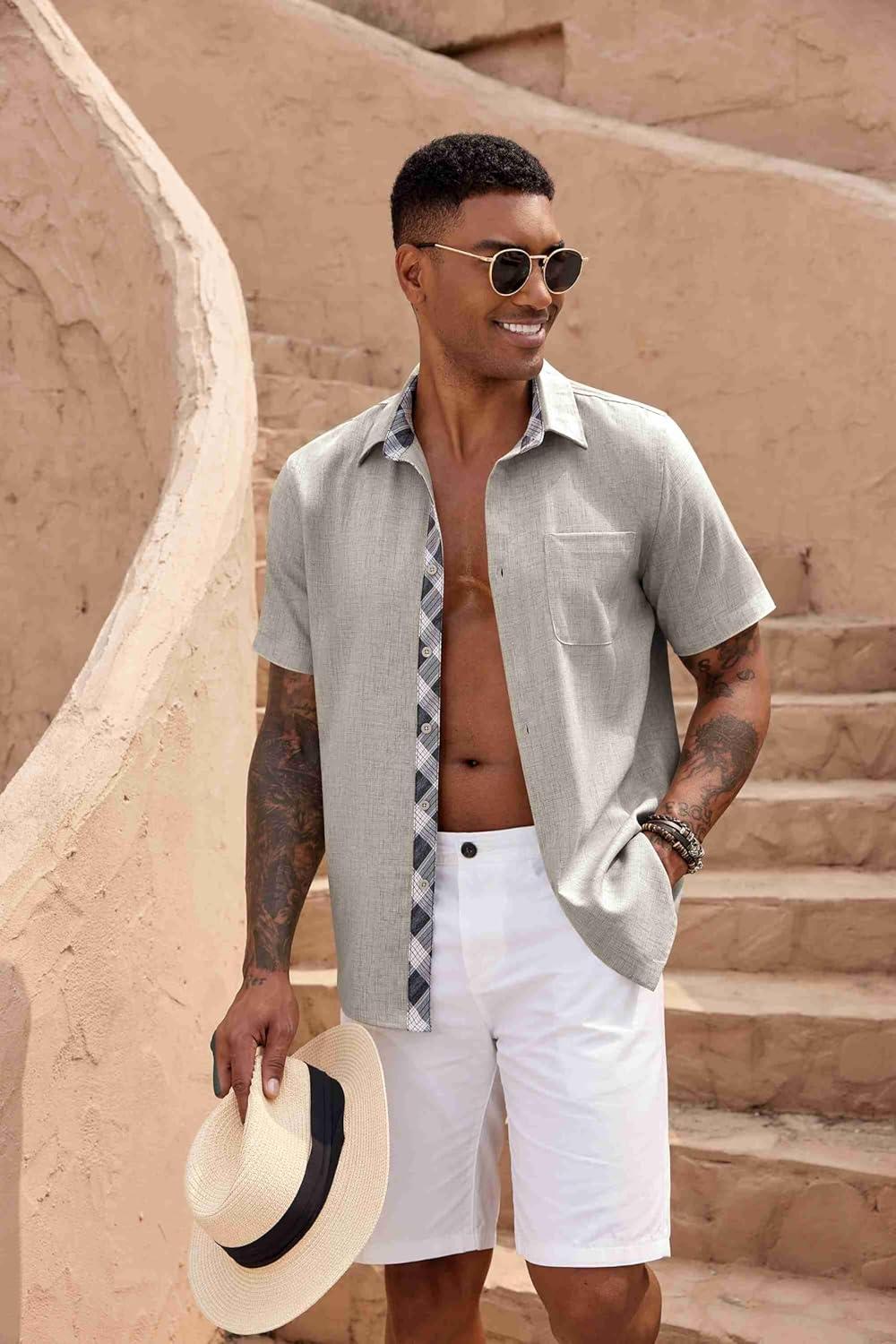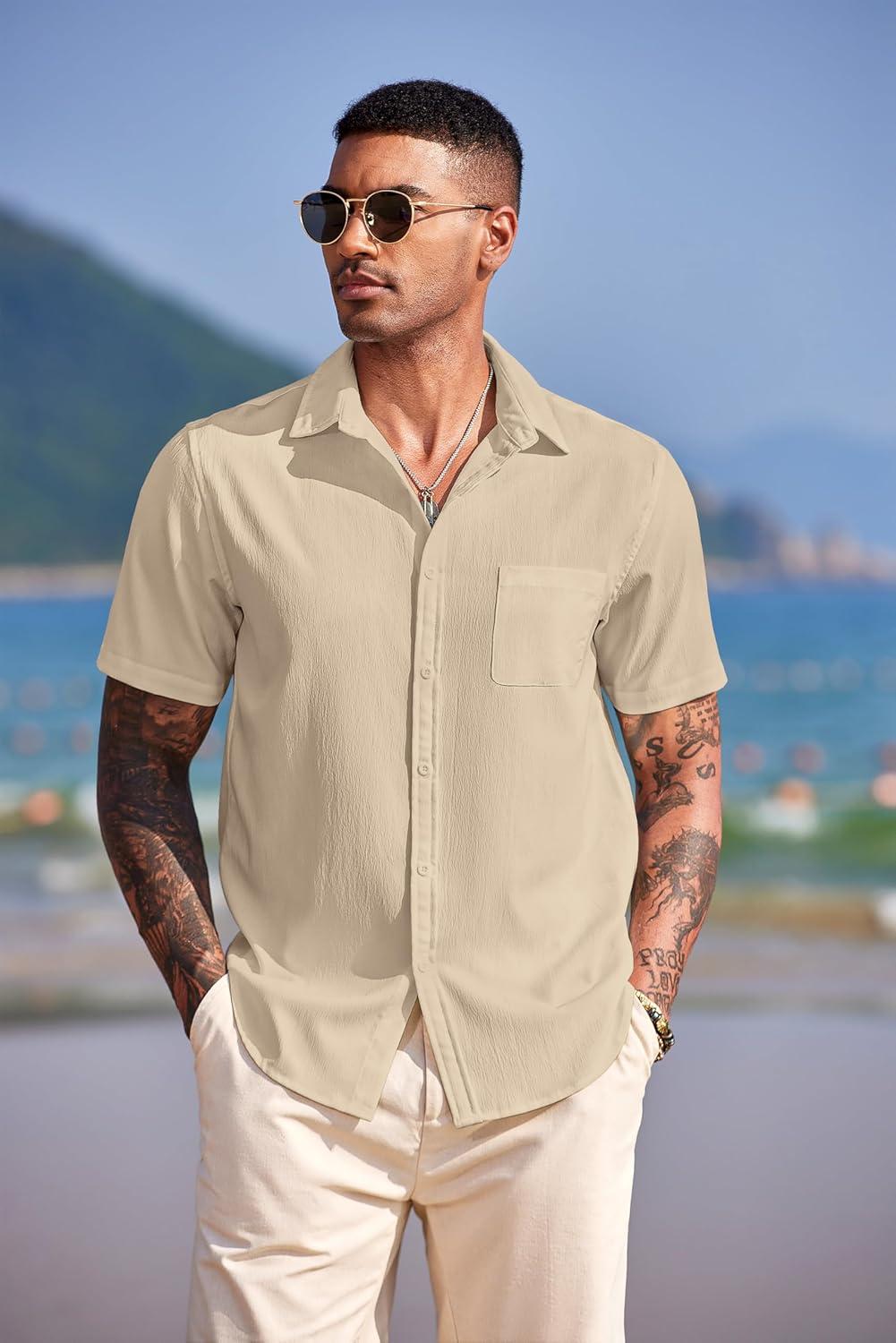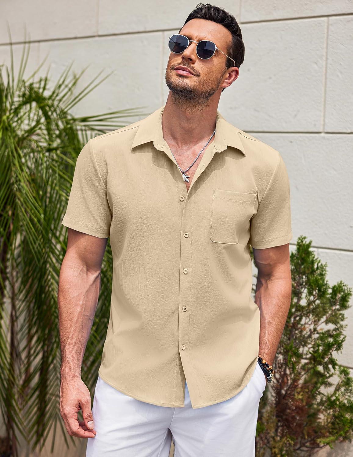 COOFANDY Shirts for Men Short Sleeve Button Down Shirt Casual Summer Beach Shirts(Stone)