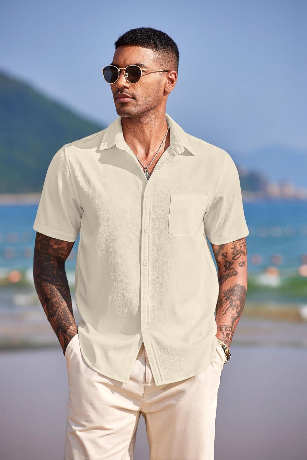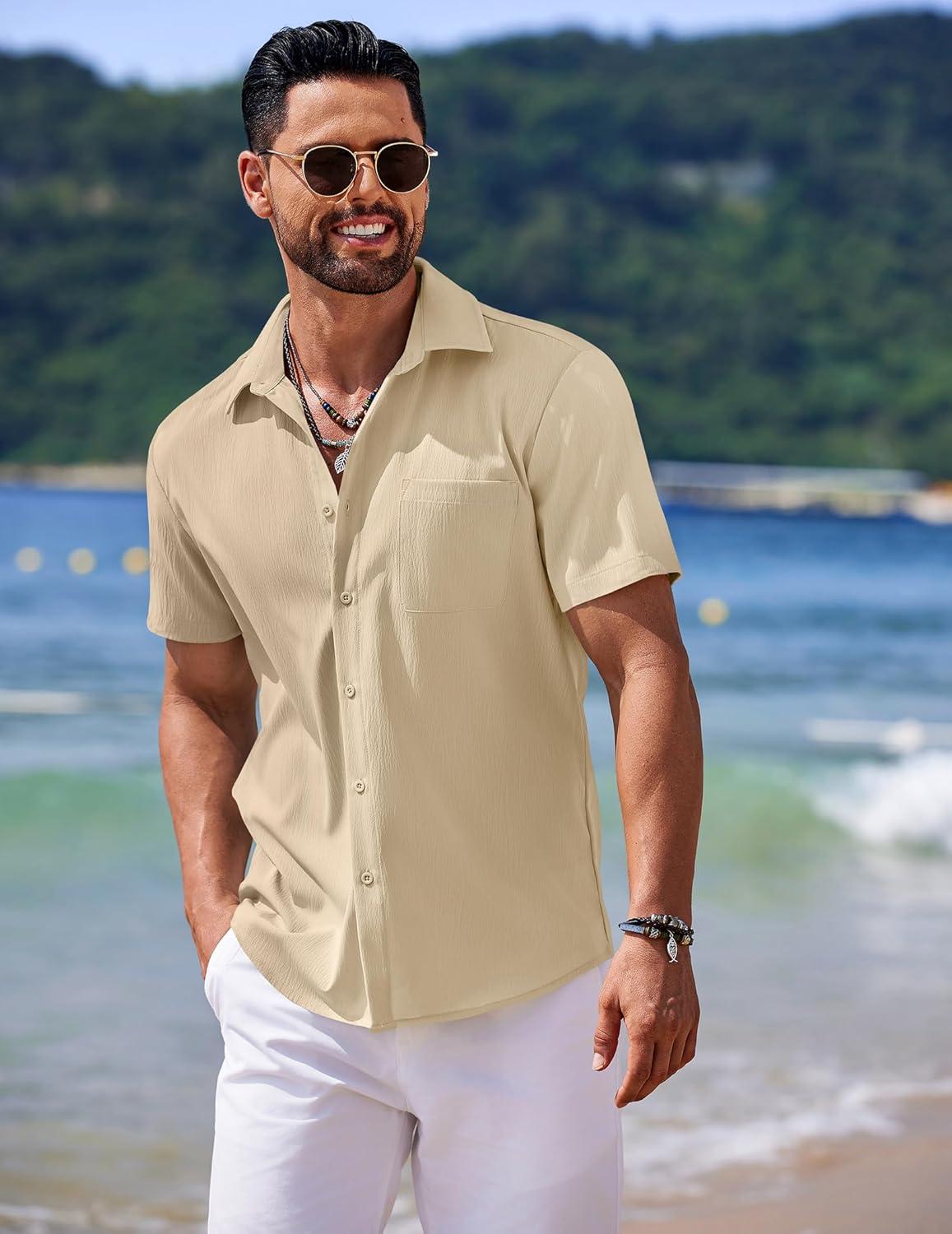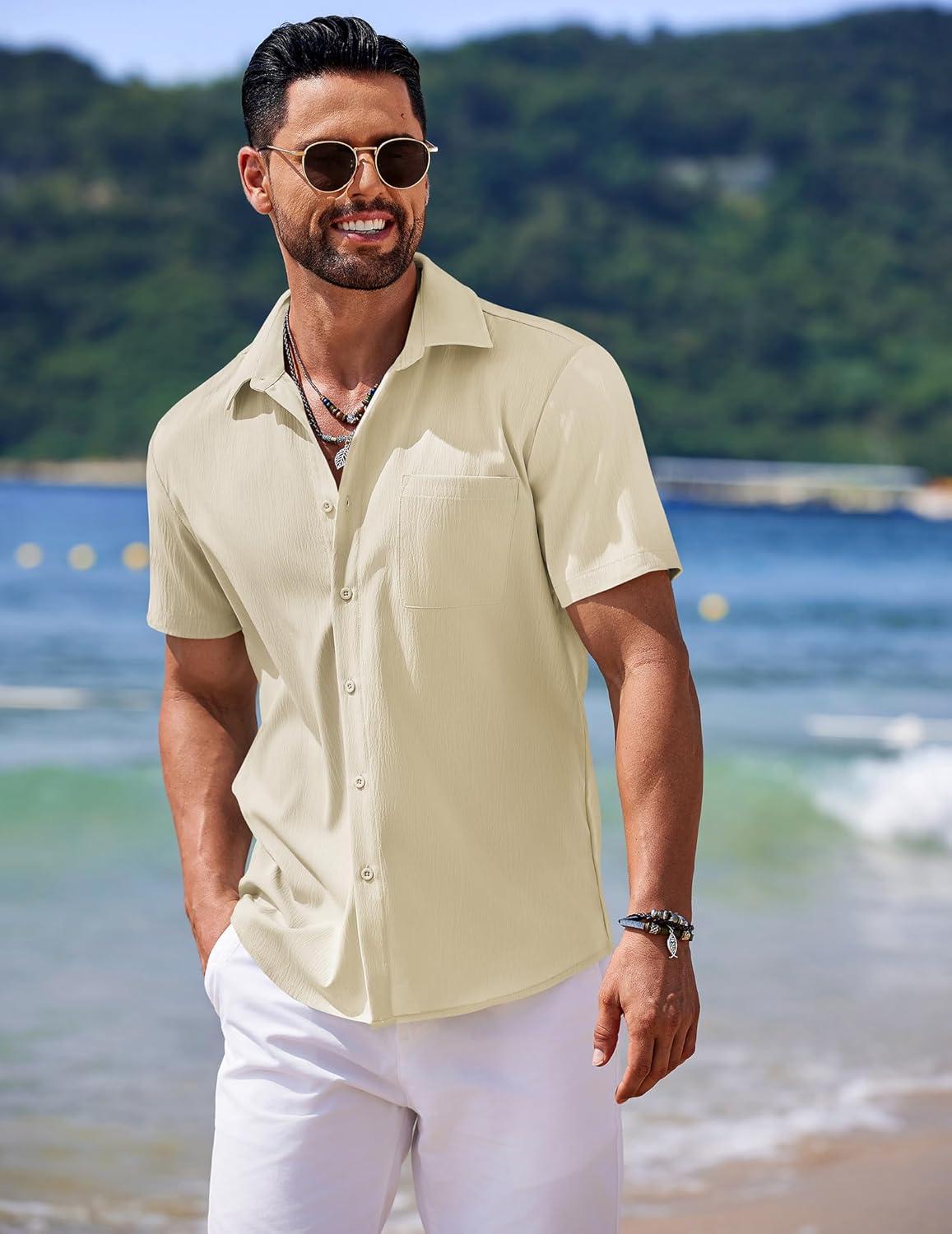 COOFANDY Shirts for Men Short Sleeve Button Down Shirt Casual Summer Beach Shirts(Vanilla Ice)