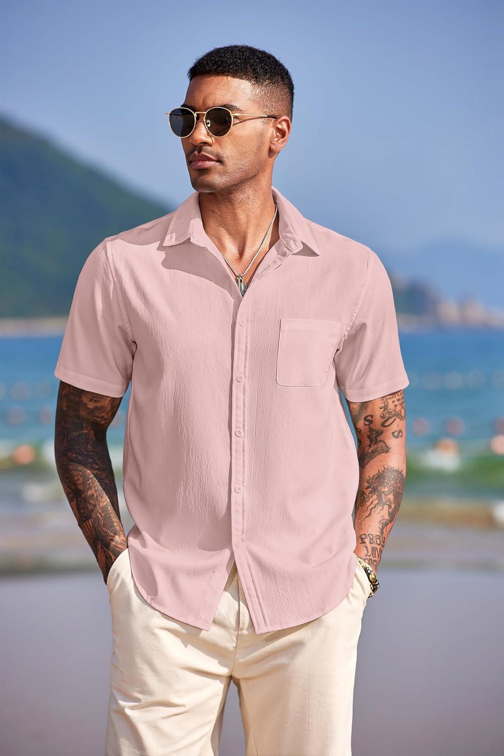 COOFANDY Shirts for Men Short Sleeve Button Down Shirt Casual Summer Beach Shirts(Veiled Rose)