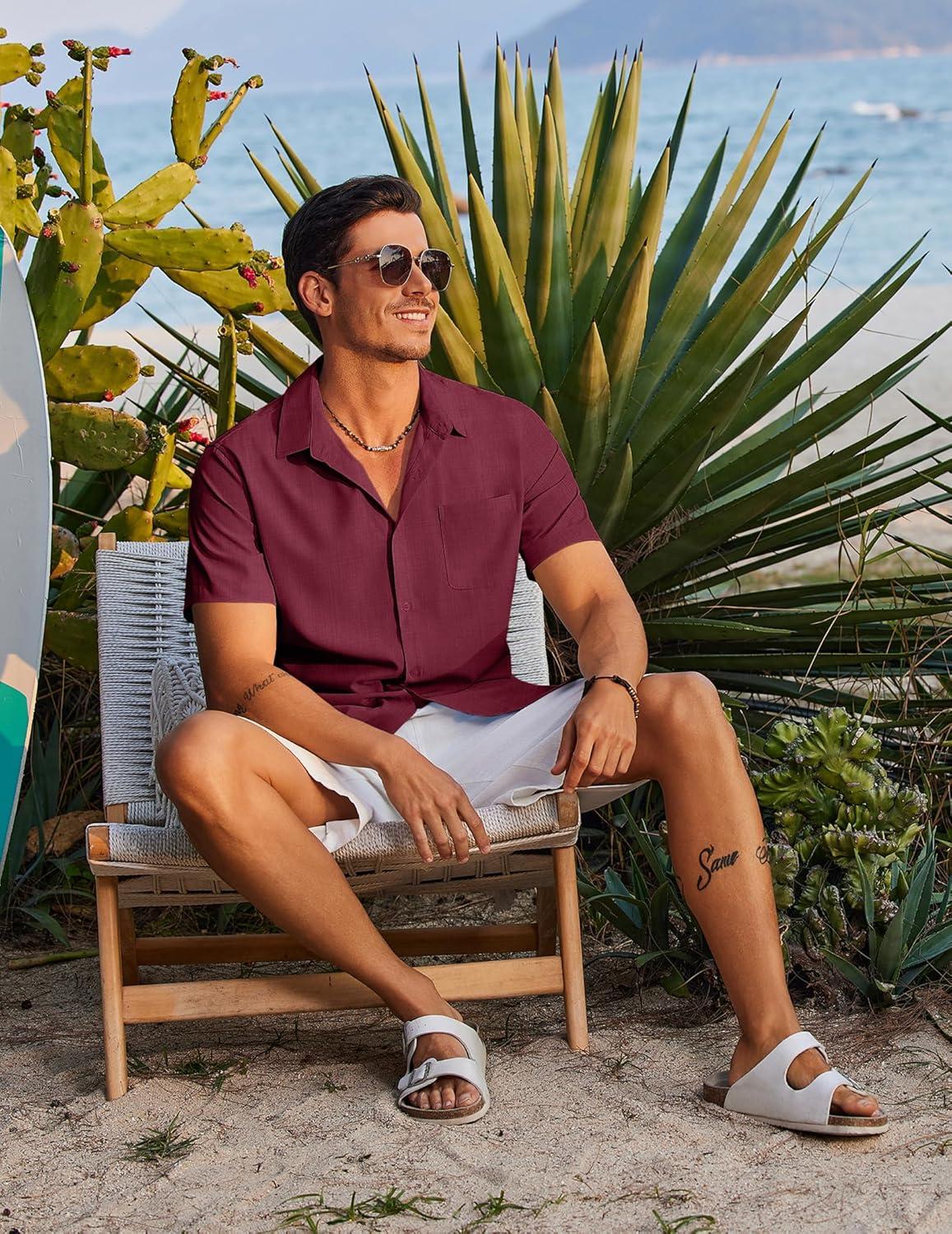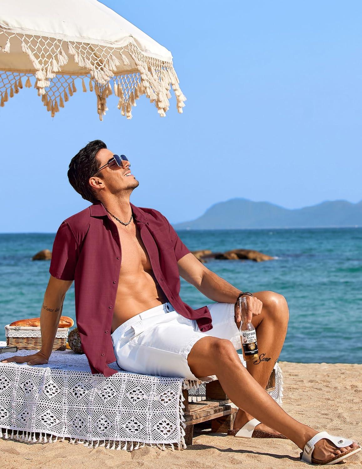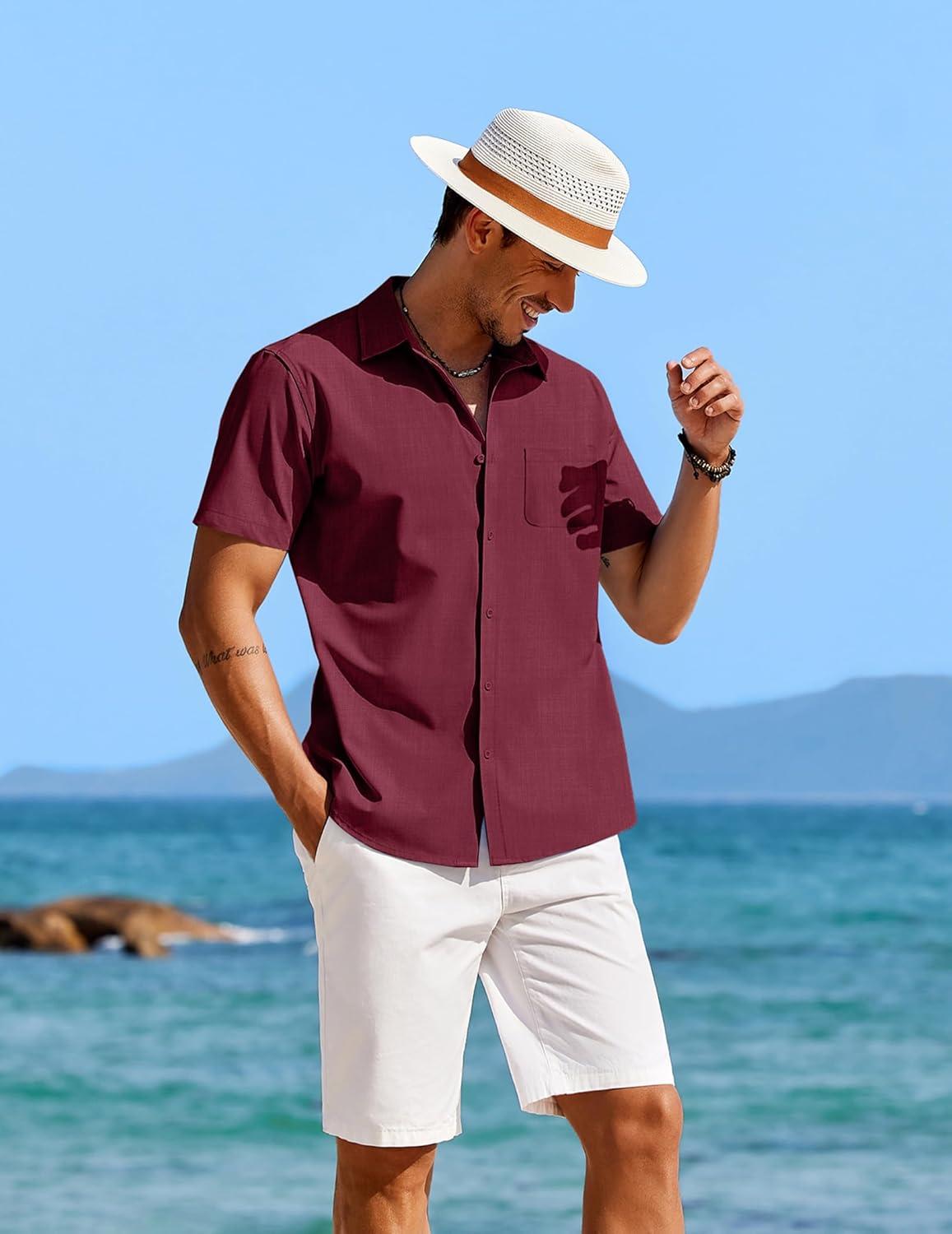 COOFANDY Shirts for Men Short Sleeve Button Down Shirt Casual Summer Beach Shirts(Wine Red)