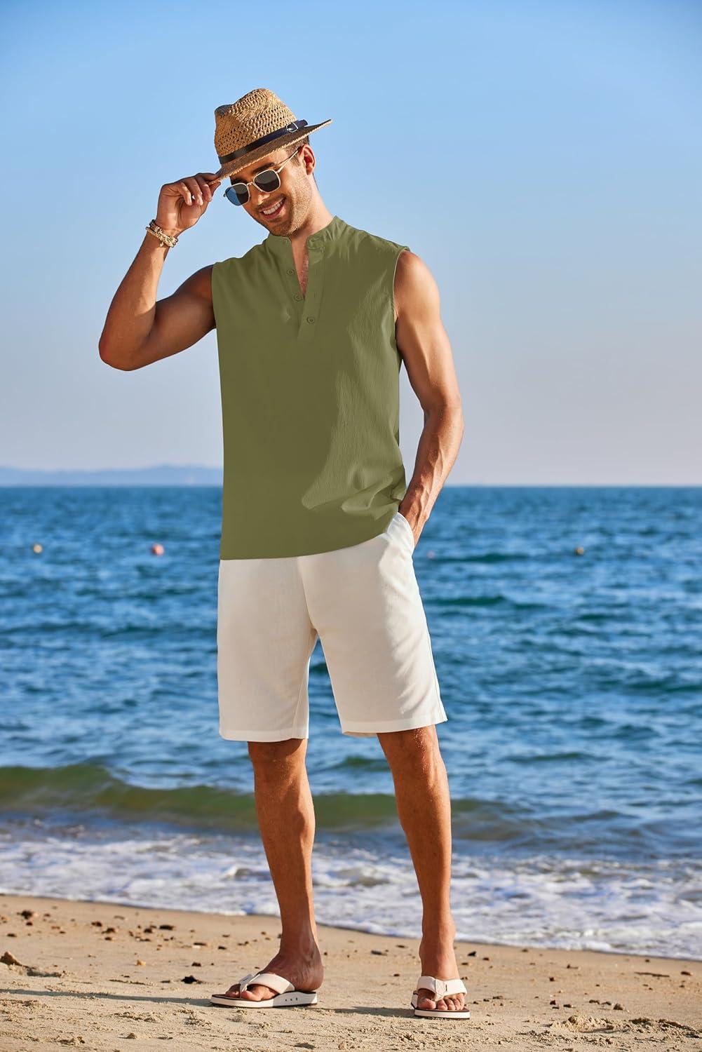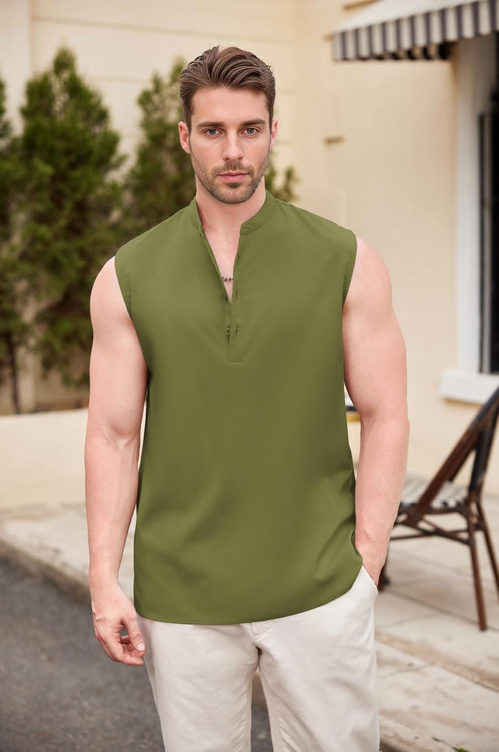 COOFANDY Sleeveless Beach Shirts for Men Summer Tank Shirts Casual Henley Tank Top(Army Green)