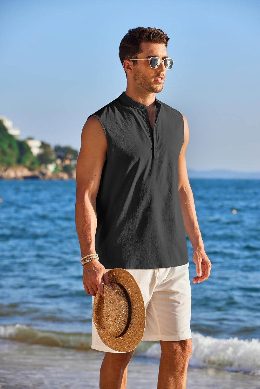 COOFANDY Sleeveless Beach Shirts for Men Summer Tank Shirts Casual Henley Tank Top(Dark Grey)