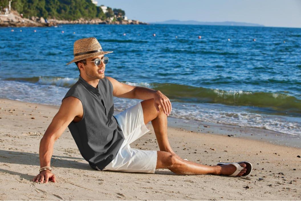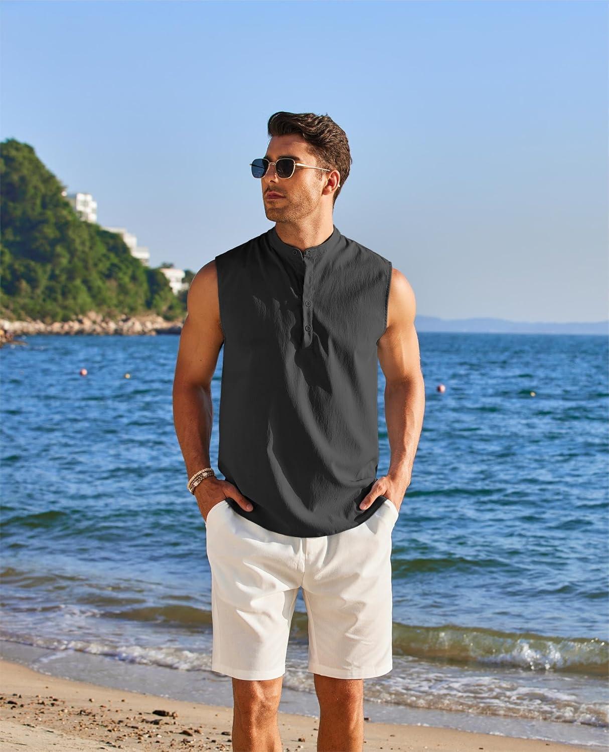 COOFANDY Sleeveless Beach Shirts for Men Summer Tank Shirts Casual Henley Tank Top(Black)