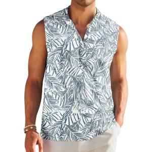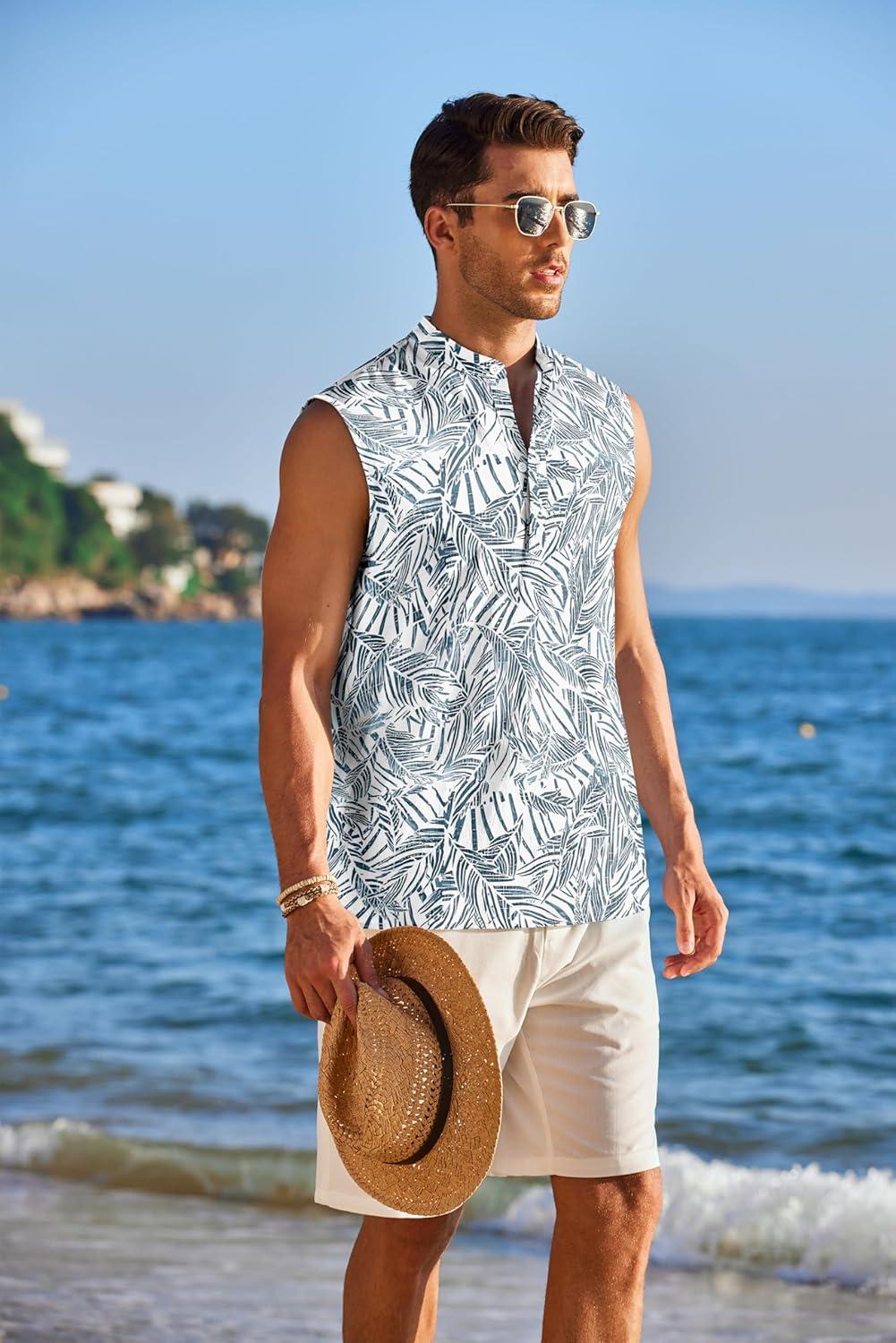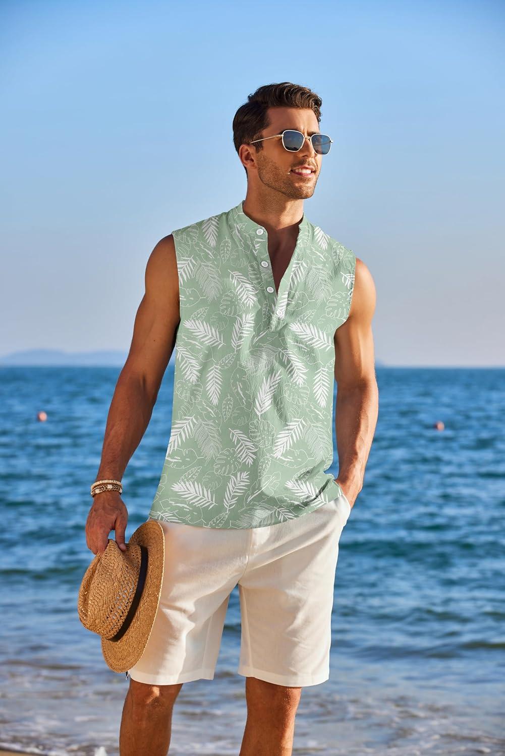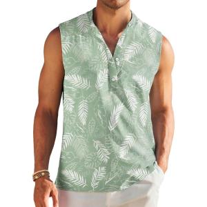 COOFANDY Sleeveless Beach Shirts for Men Summer Tank Shirts Casual Henley Tank Top(Green Leaves)
