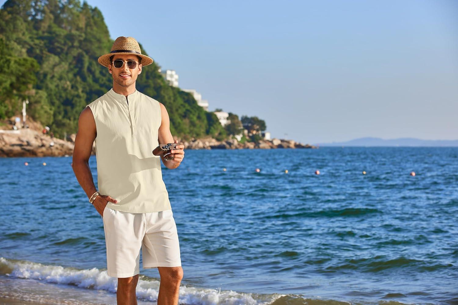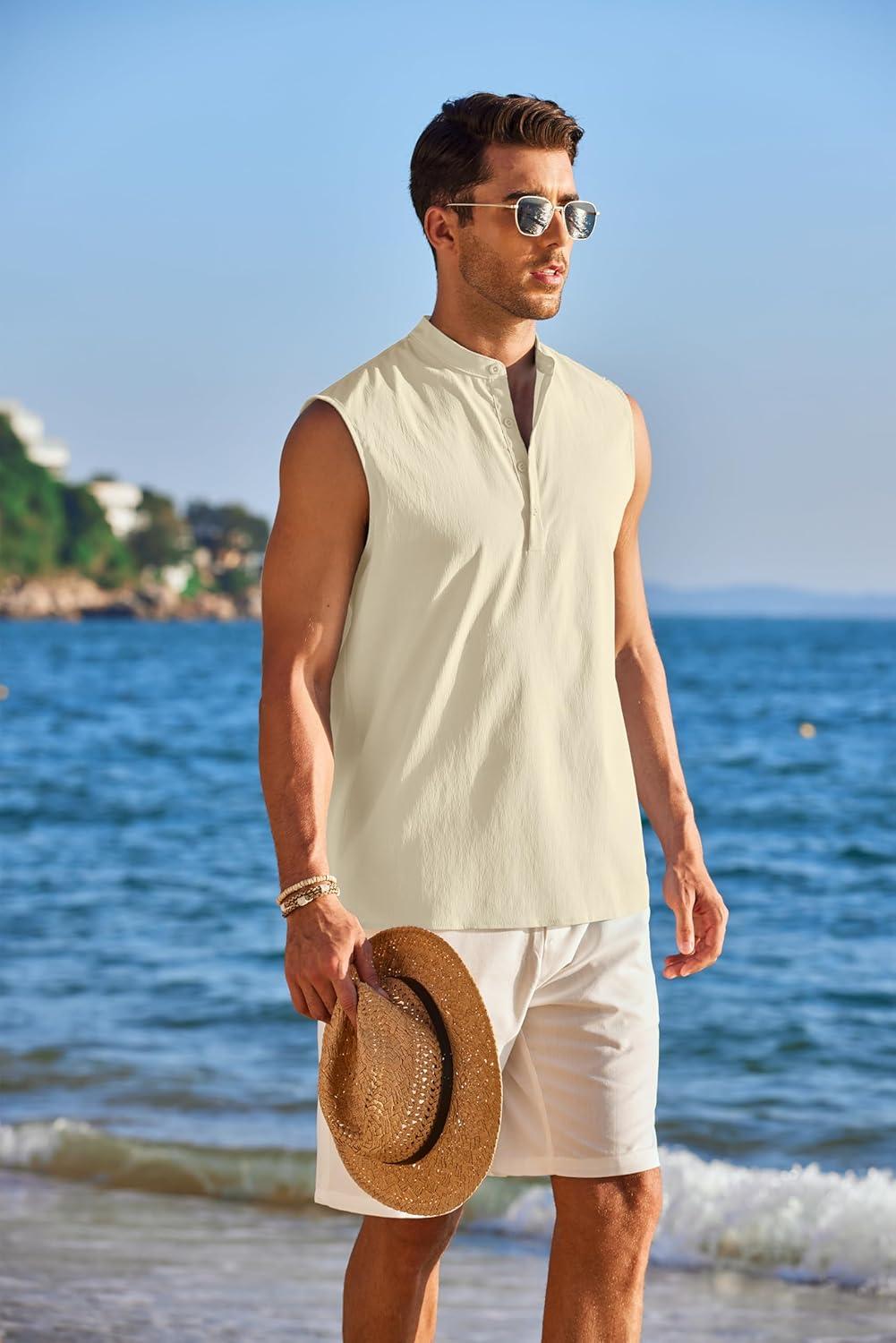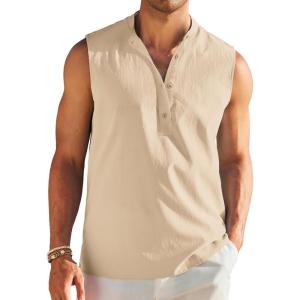 COOFANDY Sleeveless Beach Shirts for Men Summer Tank Shirts Casual Henley Tank Top(Cream)