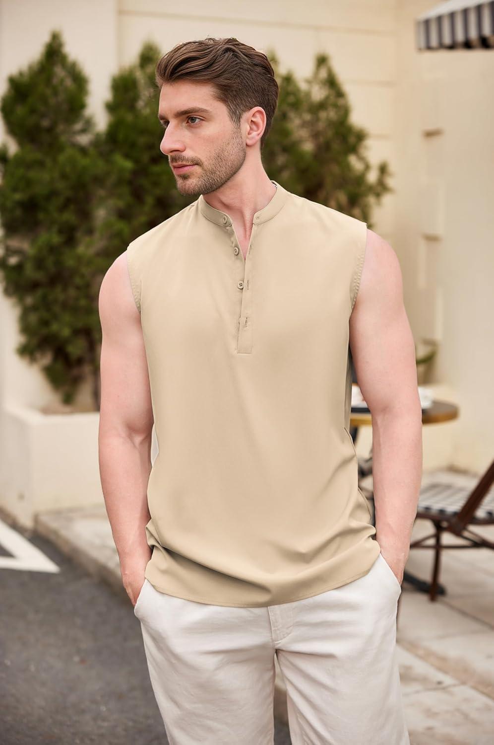 COOFANDY Sleeveless Beach Shirts for Men Summer Tank Shirts Casual Henley Tank Top(Light Brown)