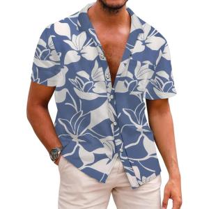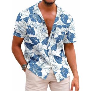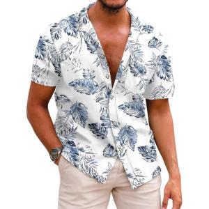• COOFANDY Mens Hawaiian Shirts Short Sleeve Casual Button Down Tropical Beach Shirt(Royal Blue / White Leaf)