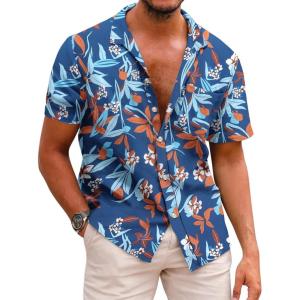 • COOFANDY Mens Hawaiian Shirts Short Sleeve Casual Button Down Tropical Beach Shirt(Royal Blue / Red Leaf)