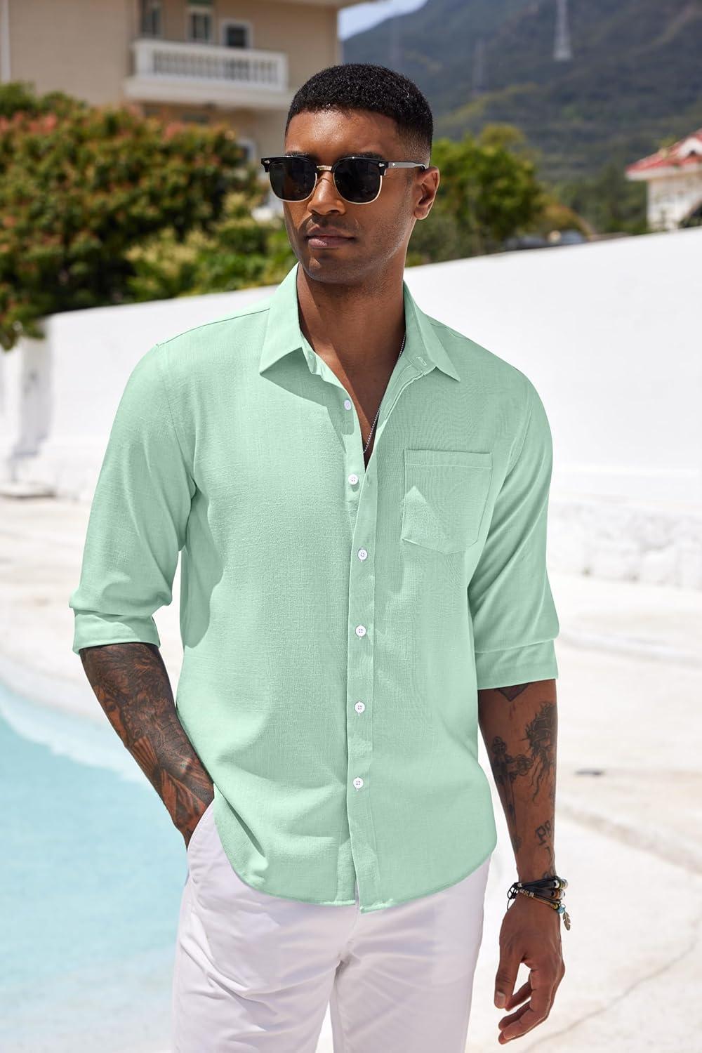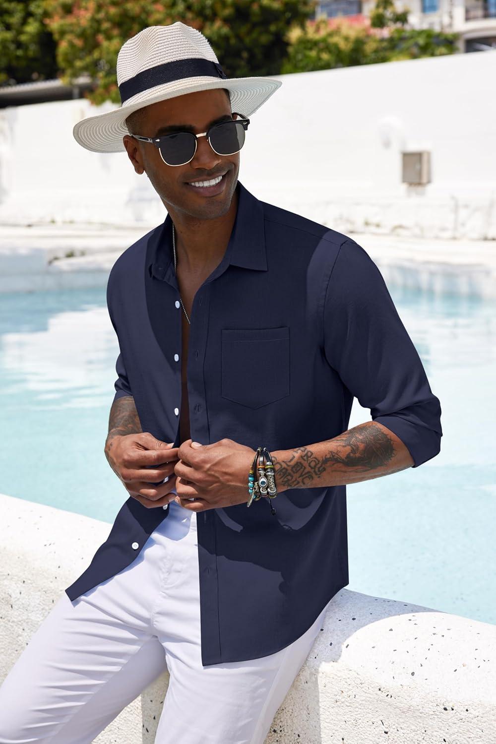 COOFANDY Mens Button Down Shirts Short Sleeve Casual Summer Beach Shirts for Men Vacation Wedding Linen Shirt(Clear Blue)