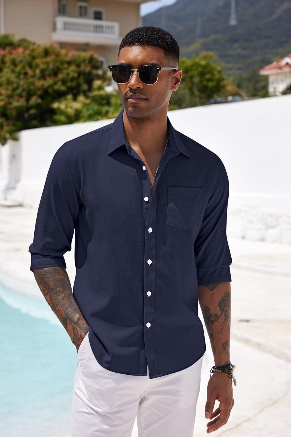 COOFANDY Mens Button Down Shirts Short Sleeve Casual Summer Beach Shirts for Men Vacation Wedding Linen Shirt(Blue)
